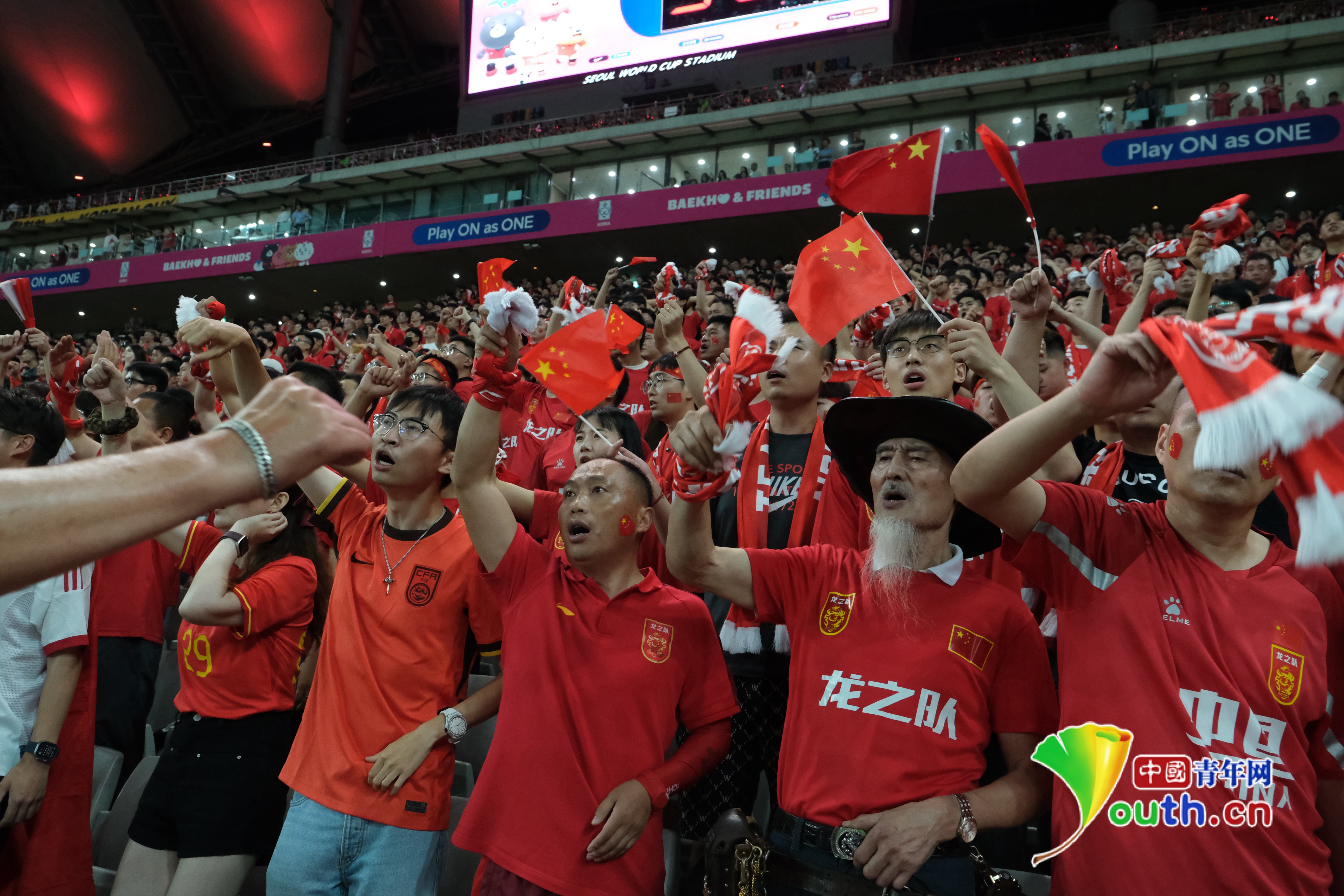 图为一位身披国旗的球迷在看台为国足加油杨逸凡/摄