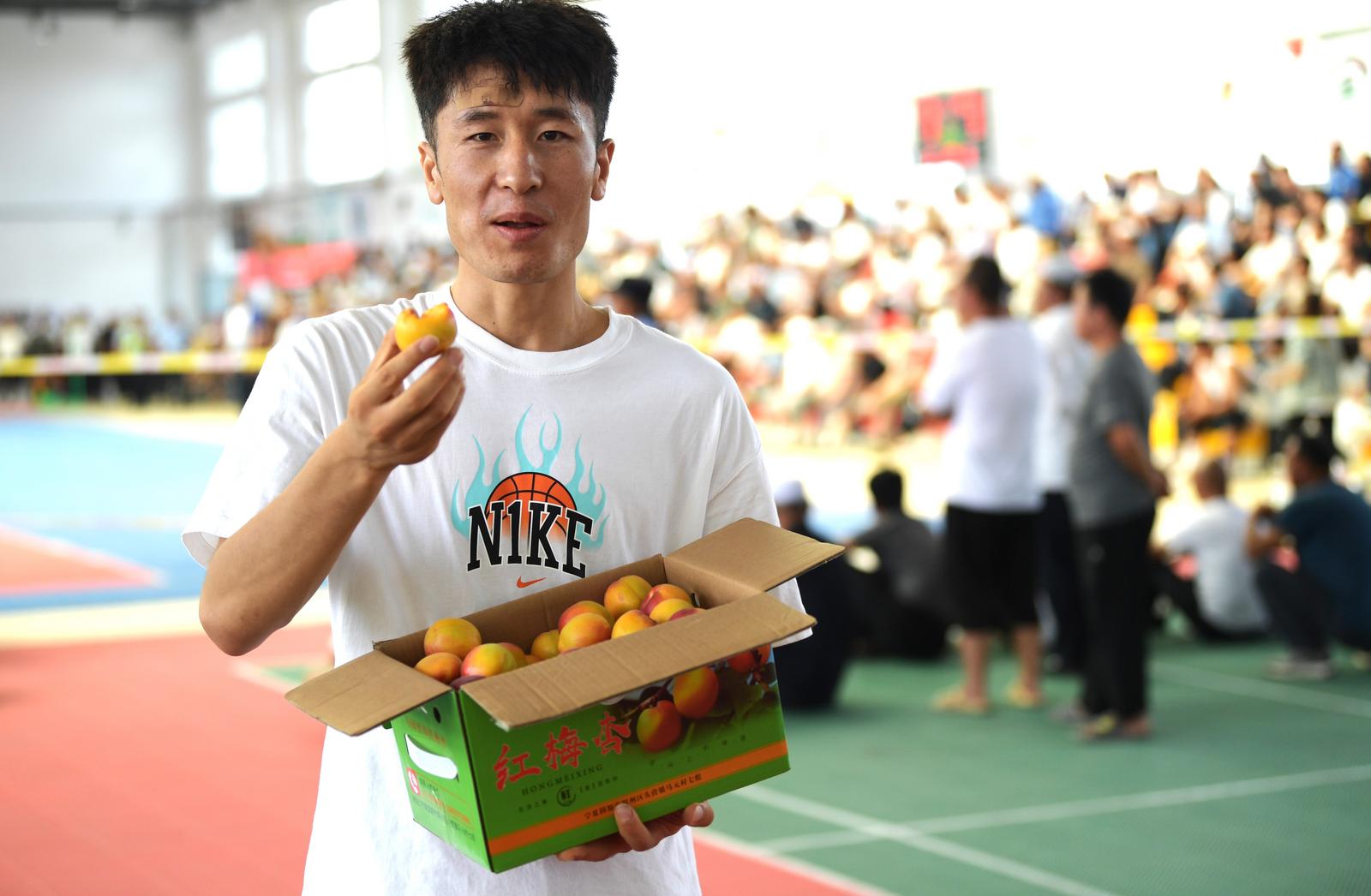 “打篮球,吃红梅杏,‘杏’好第一。”体育场馆内,篮球比赛如火如荼,场馆外农产品直播销售门庭若市。炎热的天气下,汁水饱满、唇齿留香的红梅杏,在主播的推荐下,深受消费者青睐。