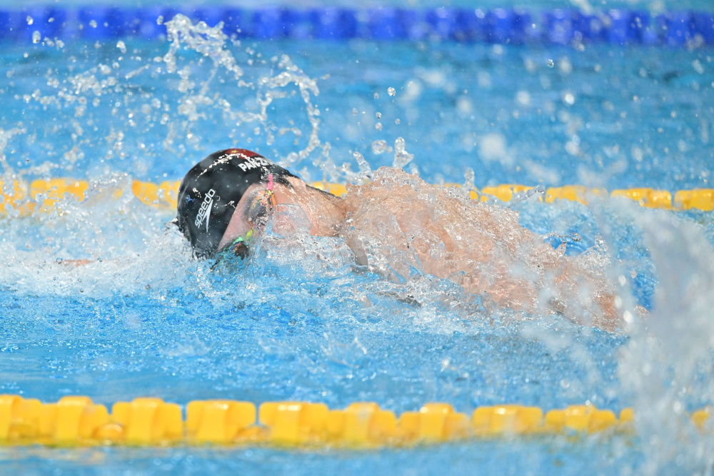 2月17日,多哈游泳世锦赛男女4X100米自由泳接力决赛,中国队第一棒潘展乐在比赛中。新华社记者 薛宇舸 摄