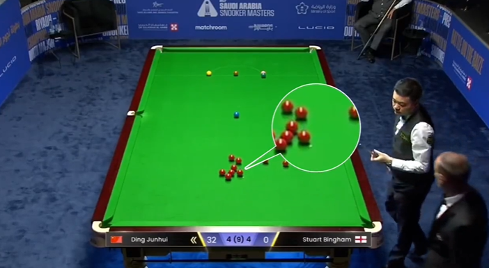 决胜局,丁俊晖准进红球率先上手,然而在围球过程中不幸打掉皮头,击中红球,被判犯规。这一离奇的犯规,让丁俊晖只能无奈苦笑。之后,宾汉姆单杆超分,最终以5比4战胜丁俊晖,晋级16强。