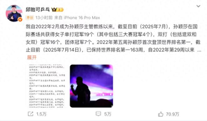 7月16日晚,孙颖莎的主管教练邱贻可在个人社交媒体发长文,晒出了孙颖莎近年乒乓球比赛战绩,并表示自己、队员和家人遭受到了网暴。