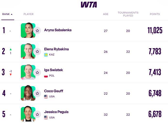 3月16日,WTA公布女子网球最新世界排名。在印第安维尔斯夺得亚军的莱巴金娜,正式超越斯瓦泰克,坐上世界第二的宝座。