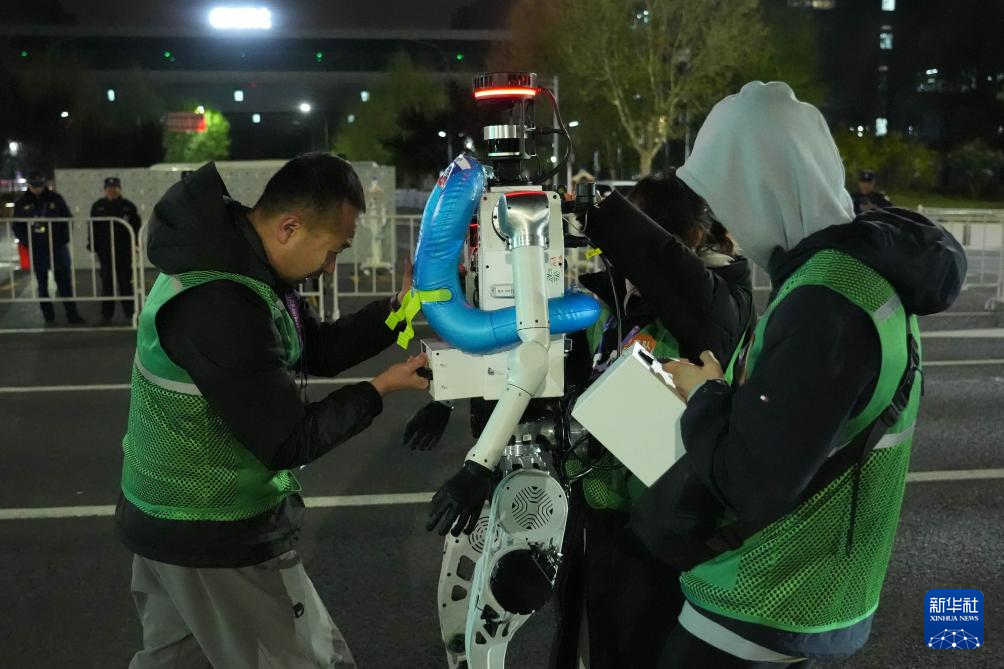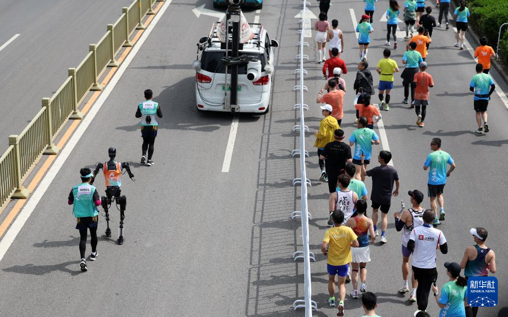 2025年4月19日,选手在北京亦庄半程马拉松暨人形机器人半程马拉松比赛中。新华社记者 曹灿 摄