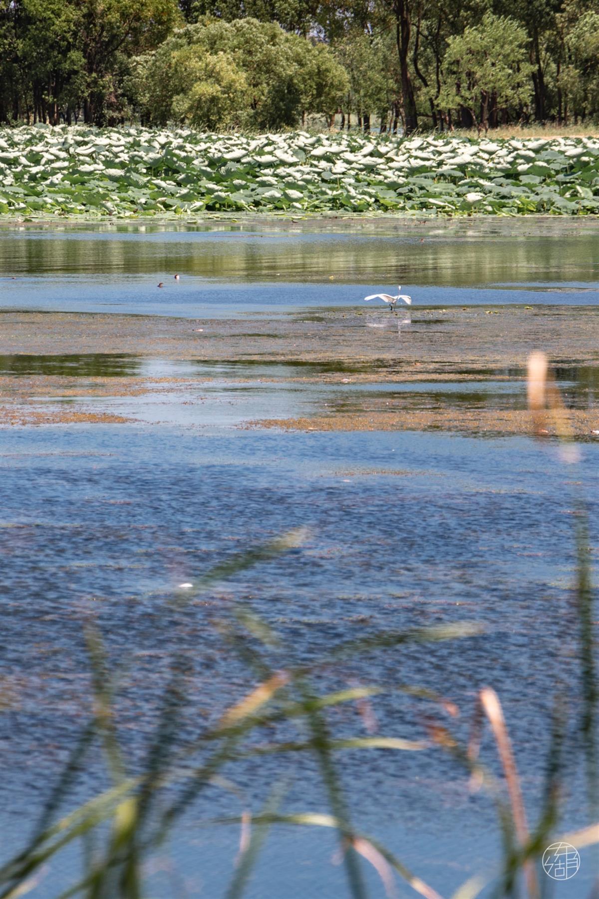 半塘荷花半塘睡莲,花朵高低错落,占据了整个湖面。穿行于木质栈道上,惊起数只临桥而栖的水鸟,扑腾翅膀颇有“误入藕花深处,惊起一滩鸥鹭”之意。