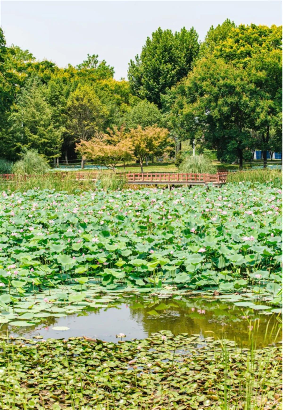 从草木初生到麦浪翻滚,8月的森林公园在强烈的阳光下,荷花香飘四溢,水杉林郁郁葱葱,目光所及之处都是满满的绿色。