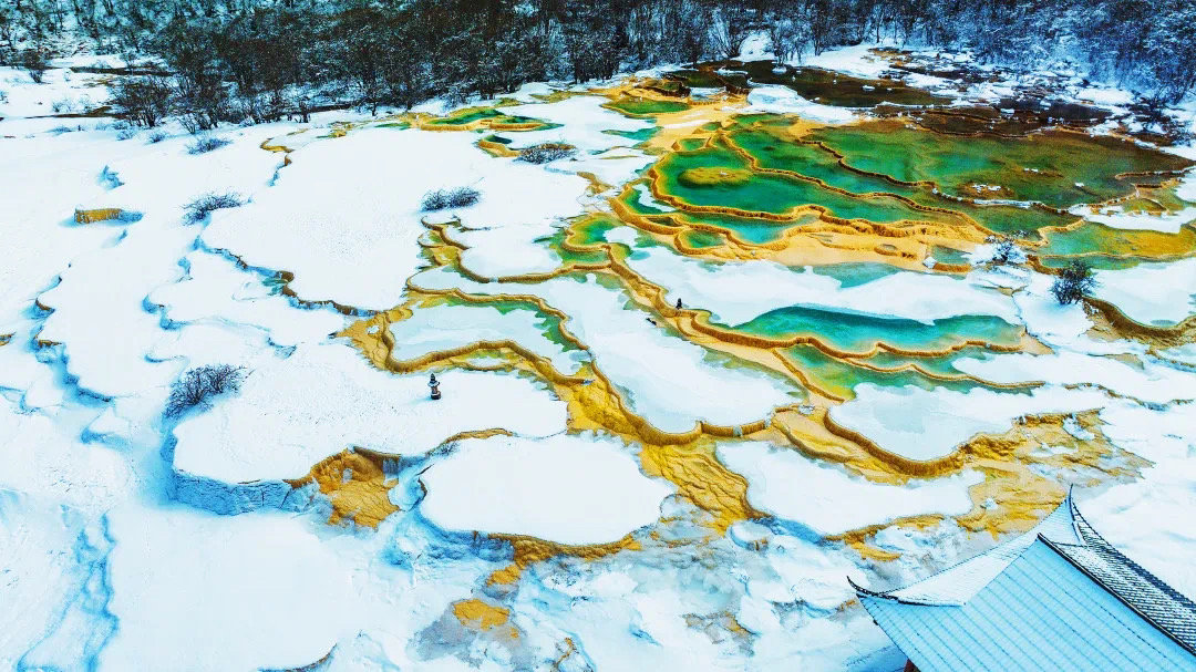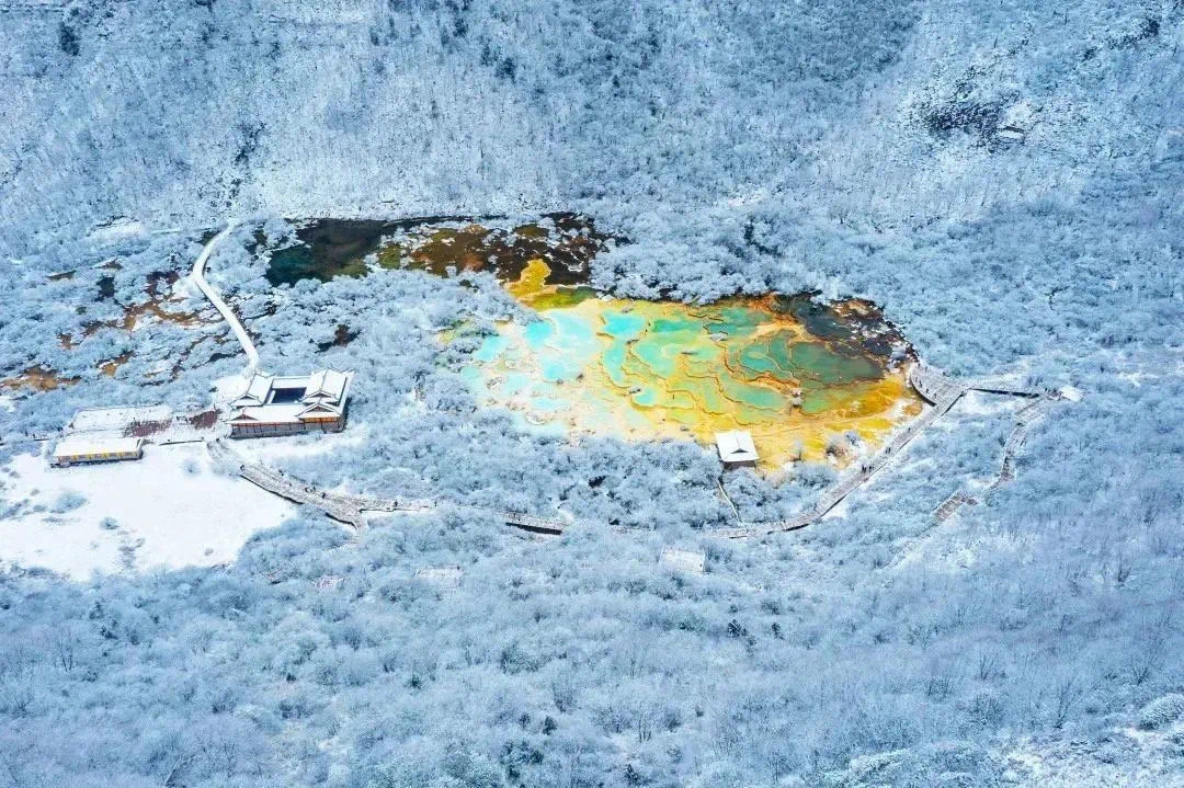 作为世界自然遗产地的黄龙,拥有世界上规模最大的钙华彩池群,被誉为“人间瑶池”。由于主景区海拔超过3000米,冬季之时这里气温较低,常常大雪纷飞,但对于冰雪爱好者来说,是难得的冬日胜景。