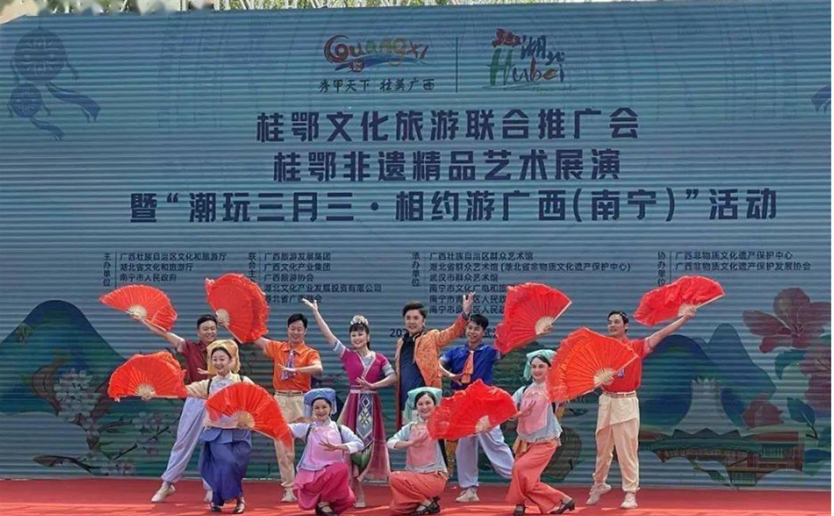 为推动广西“壮族三月三”民族节庆活动走向全国,进一步展示桂鄂两省(区)特别是广西(南宁)少数民族地区文化和旅游的独特魅力,4 月 8 日,广西壮族自治区文化和旅游厅、湖北省文化和旅游厅、南宁市人民政府共同举办了桂鄂文化旅游联合推广会、桂鄂非遗精品艺术展演暨“潮玩三月三·相约游广西(南宁)”活动。