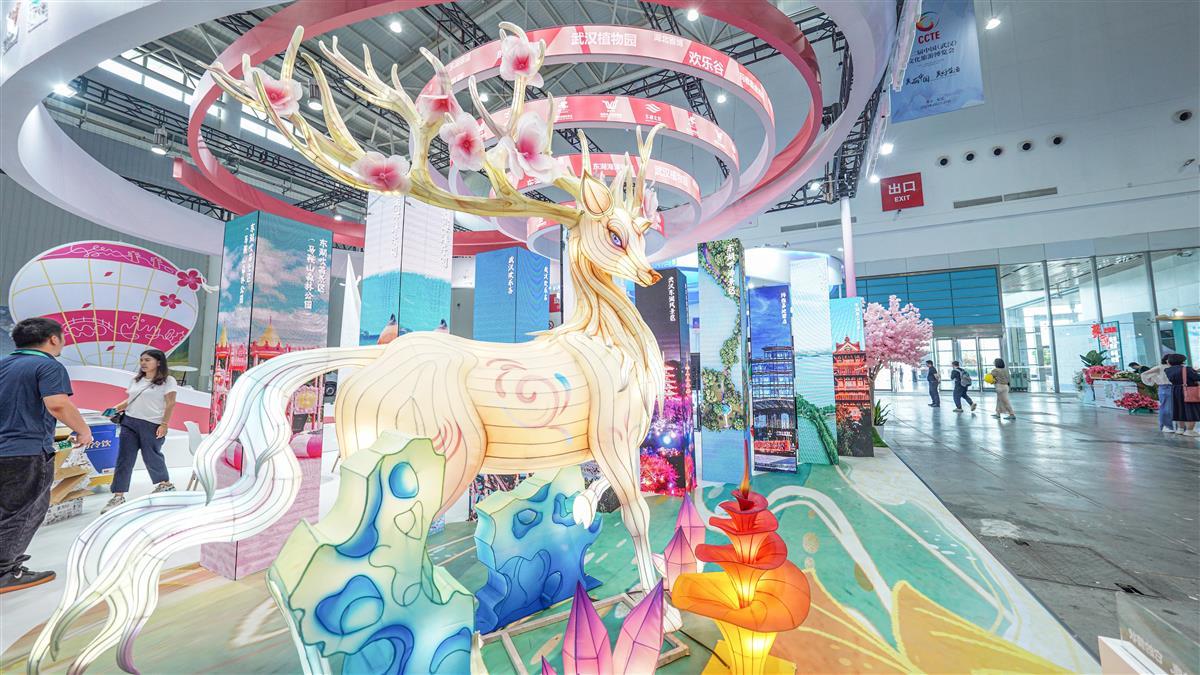 记者在现场看到,展台最前方,一只来自古代神话的神兽“夫诸”迎接来往游客。这只形似鹿的四角神兽从“东湖奇妙夜”飞奔而来,向全球游客展示东湖梦幻的一面。在“夫诸”身后的立柱LED屏,将会播放东湖各处美景,从清晨到月夜,东湖的美24小时不间断。