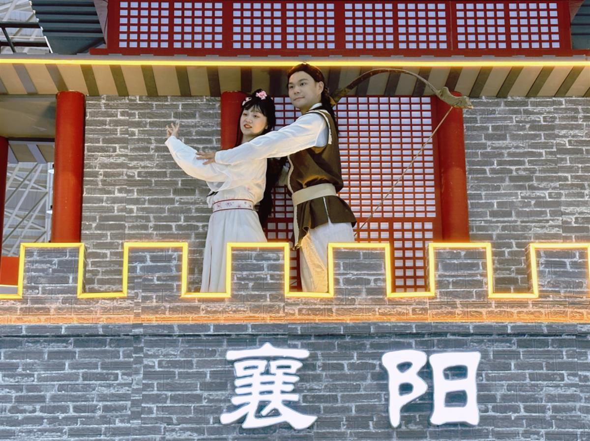 “依稀往梦似曾见,心内波澜现。抛开世事断愁怨,相伴到天边……”当《铁血丹心》这段熟悉的旋律在武汉国际博览中心响起时,现场市民游客都蜂拥而至B2区。只见一座古朴的“襄阳”城楼上,一对古装男女正拿着弓箭翩翩起舞。“这不是郭靖黄蓉嘛!一段表演立马将人带入到金庸先生的武侠世界,有意思!”围观市民纷纷举着手机记录下这一精彩画面。