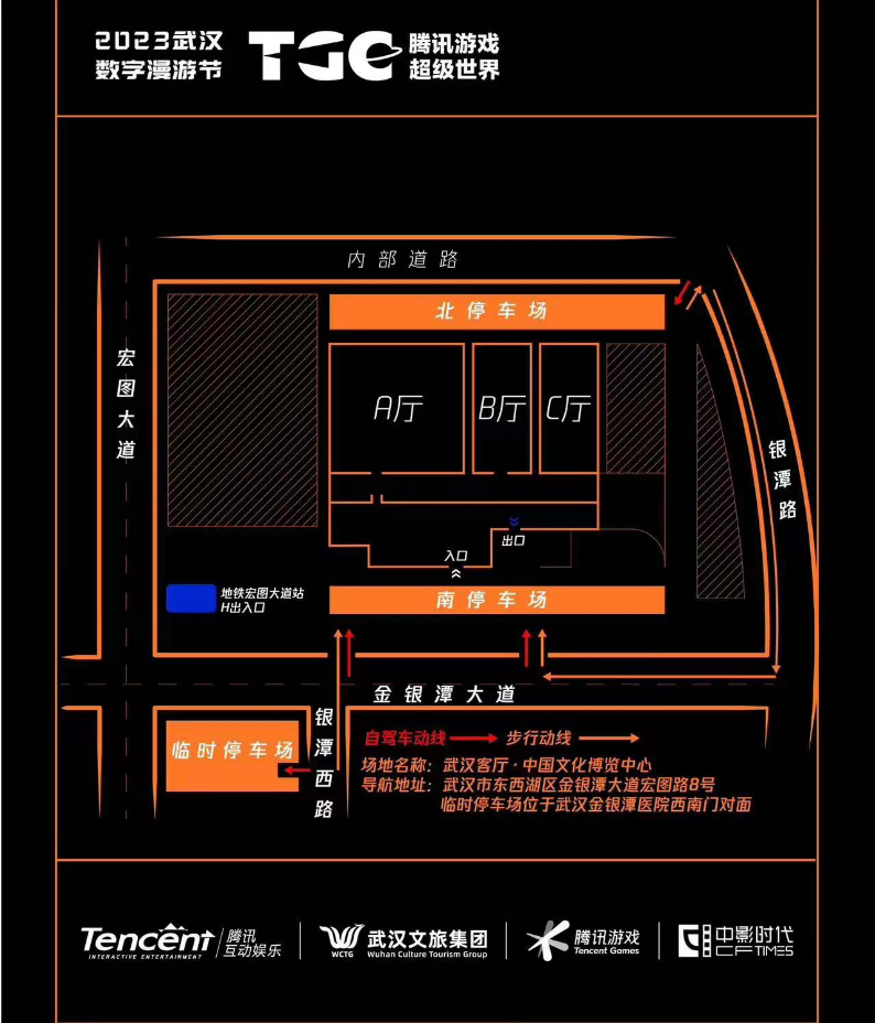 2.自驾出行:导航武汉客厅中国文化博览中心,可从银潭路进入武汉客厅北停车场,或停放在银潭西路临时停车场步行到TGC活动现场。