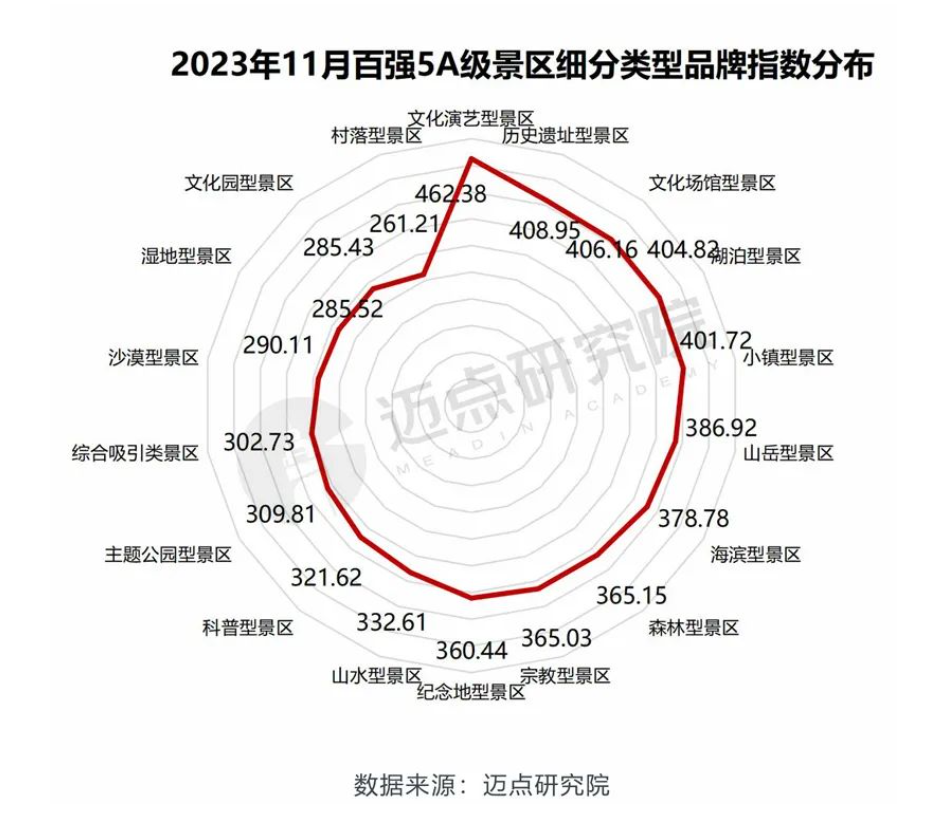 在研究分析中,迈点对百强5A级景区进行了品牌细分,具体如下图。根据这一细分类型品牌指数,11月的前10分别为:文化演艺型景区、历史遗址型景区、文化场馆型景区、湖泊型景区、小镇型景区、山岳型景区、海滨型景区、森林型景区、宗教型景区、纪念地型景区。