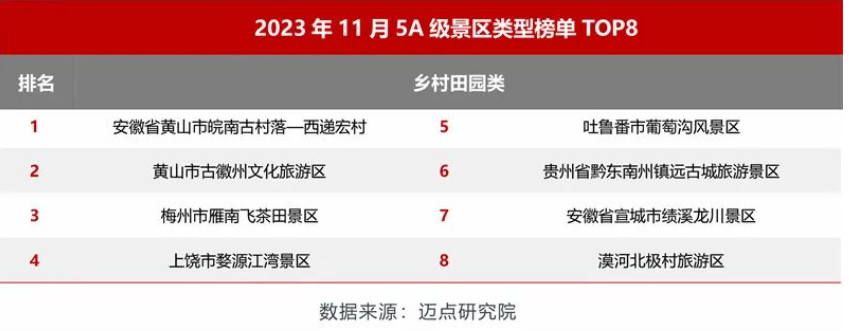 迈点称,在11月百强榜单中,增加了一大品类——乡村田园类,安徽皖南古村落—西递宏村入榜(总排名第95)。在乡村田园类的前十名景区中,古徽州地区范围内的占了4个。其中,(皖南古村落)黟县西递宏村排名第一,第二是黄山市古徽州文化旅游区,第四是婺源江湾景区,第七是绩溪龙川景区。