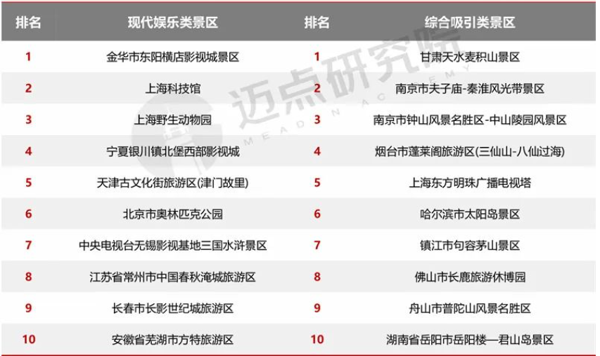 除了综合排名榜,迈点还通过景区类型划分方式,进行了细分类景区榜单排名。其中,黄山风景区排名“自然景观类景区”榜第二位,第一位是峨眉山景区。