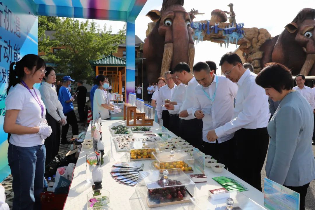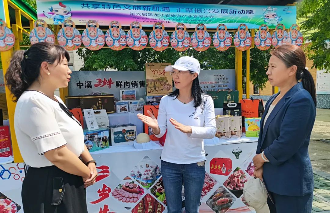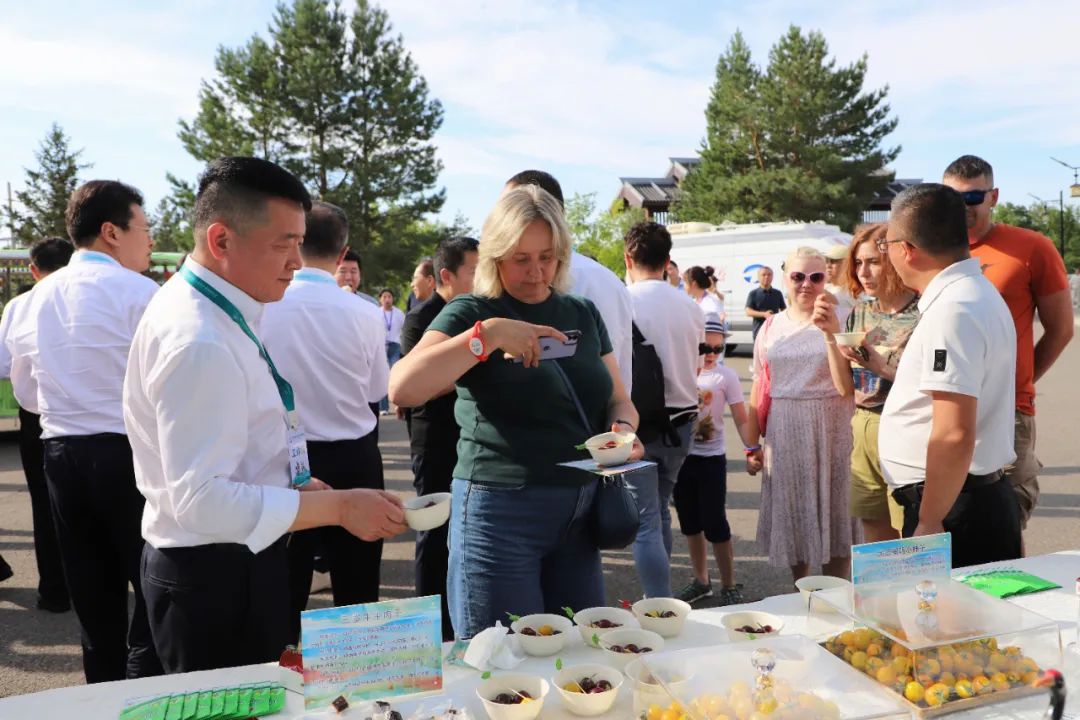 在水师温泉主楼门前,一席文农旅融合的饕餮盛宴正在举行,罗西亚大街肉枣、三岁牛牛肉干、北极冷饮、宏绿食品、黎光大樱桃、大五福玛小柿子等我区特色产品精彩呈现、光彩夺目,各个展位前人头攒动、热闹非凡,各级领导、媒体记者、网络达人、企业客商及国内外游客纷纷驻足品鉴。