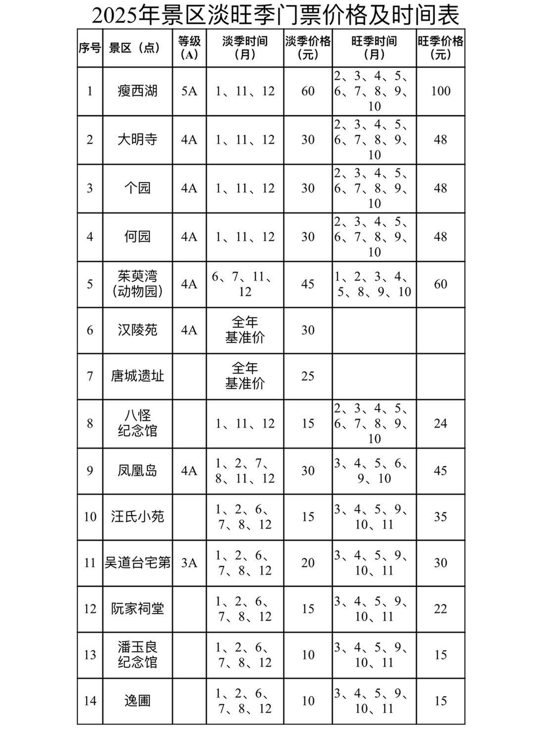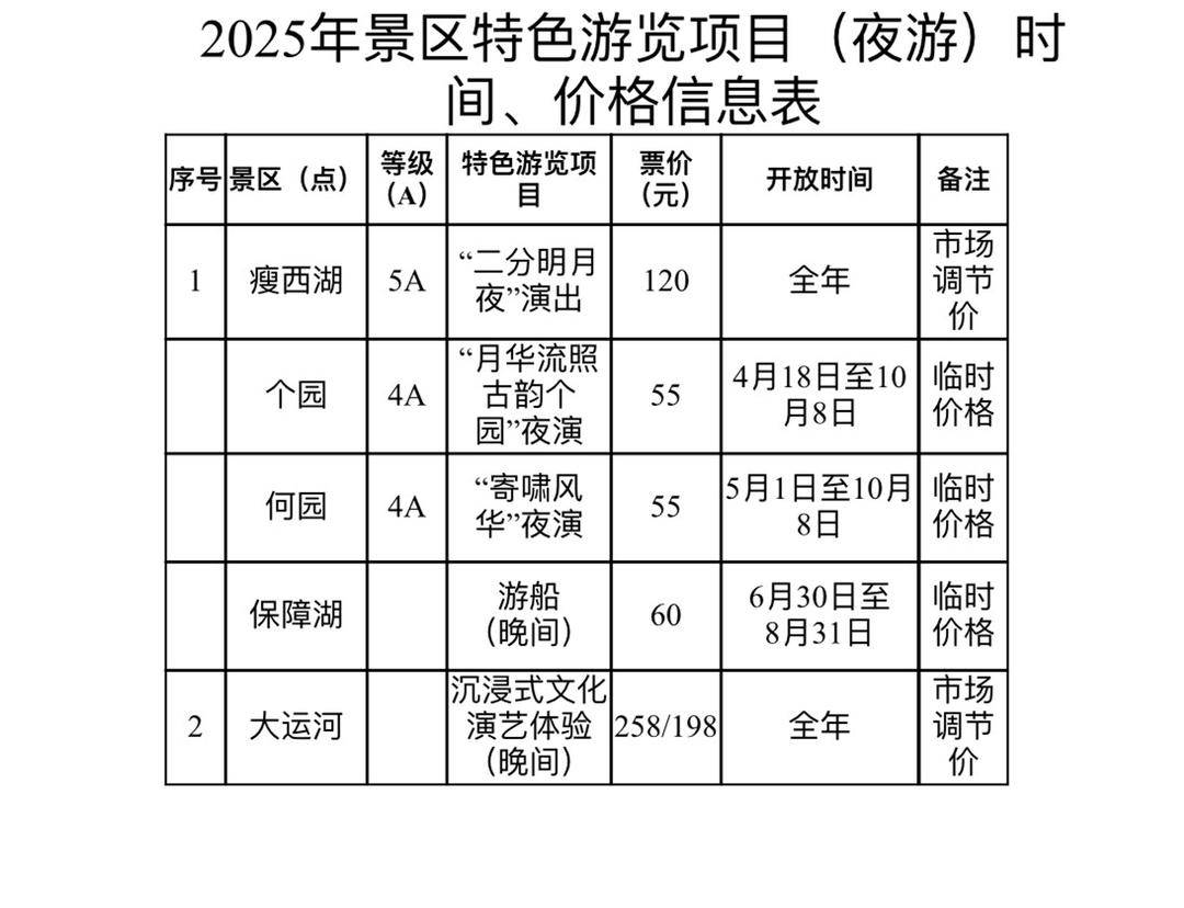 扬子晚报网9月30日讯(通讯员扬发改记者陈咏)记者30日从扬州市发改委获悉,为持续做好“两古(古运河、古城)一湖(瘦西湖)三都(世界运河之都、东亚文化之都、世界美食之都)”文章,打造“四季旺游”核心品牌,整合全市旅游资源,规范景区门票和相关服务价格行为,根据《江苏省景区门票和相关服务价格管理办法》(苏发改规发〔2023〕2号)相关规定,综合各地景区(点)申报意见,市发改委公布2025年度扬州市实行政府指导价管理景区(点)淡旺季门票价格和夜游项目及时间。