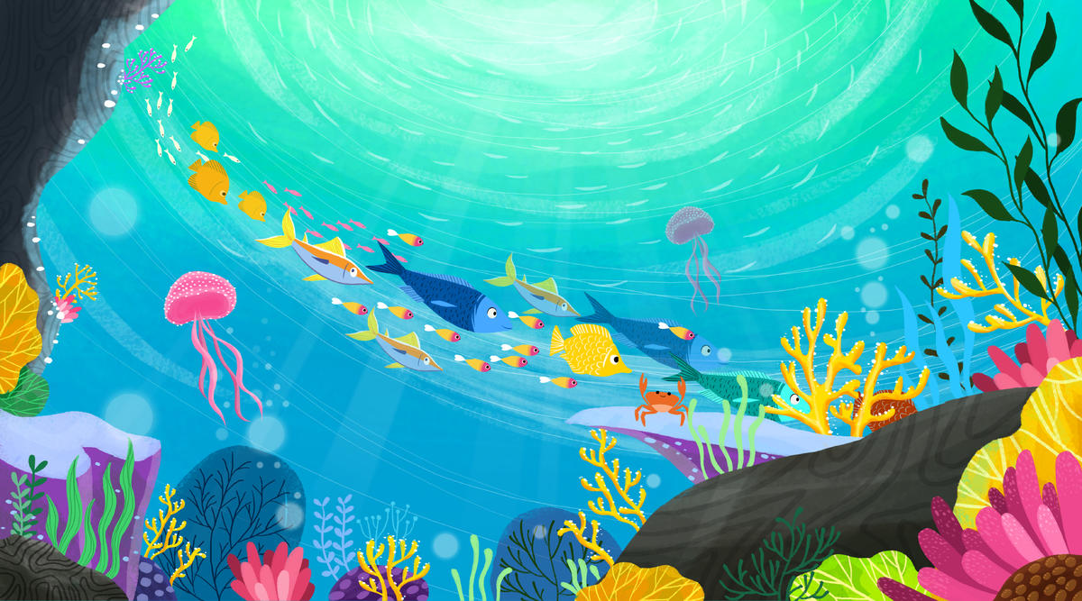 ②海面上波涛澎湃的时候,海底依然很宁静。最大的风浪,也只能影响到海面以下几十米深。阳光很难射进深海,水越深光线越暗,五百米以下就全黑了。在这一片黑暗的深海里,却有许多光点像闪烁的星星,那是有发光器官的深水鱼在游动。
