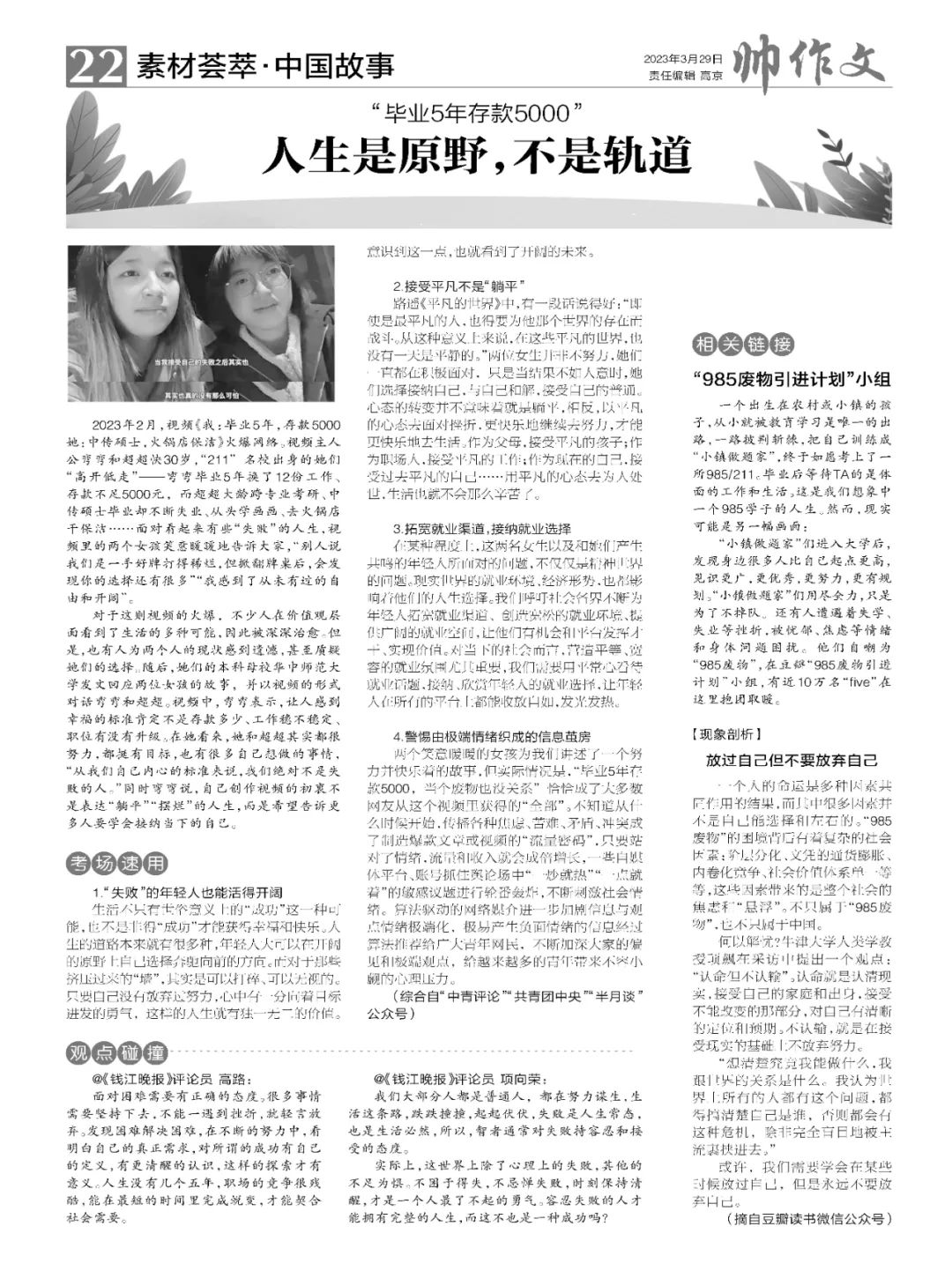 (2)舞台上,戏曲演员有登场亮相的瞬间。生活中也有许多亮相时刻:国旗下的讲话,研学成果的汇报,新产品的发布……每一次亮相,都受到众人关注;每一次亮相,也会有一段故事。