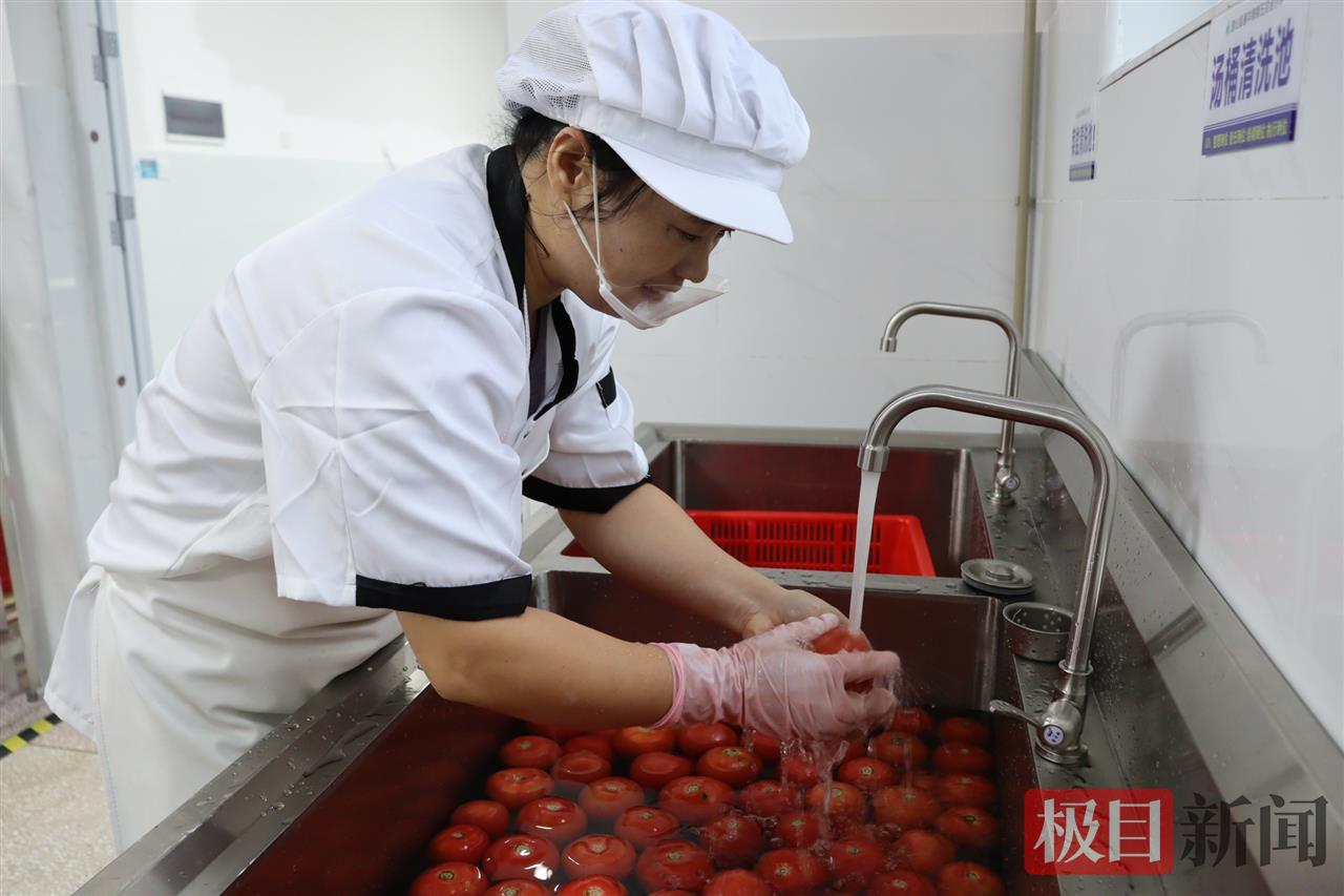 与值班教师阮家献完成双人双验后,谭静和其他几位“妈妈厨师”开始认真清洗食材,每一片青菜都要经过反复冲洗。“孩子们吃的菜,得多洗几遍才放心。”她一边说着,一边将洗净的青菜放入清水池进行第二遍漂洗。三个月前,谭静还是一位独自照顾两个上学孩子的全职妈妈,如今在孩子就读的五小食堂帮厨,这让她既能贴补家用,又能按时接孩子放学,“每天和孩子们同步作息,心里特别踏实。”