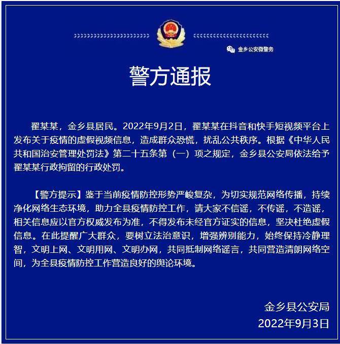 9月3日,济宁市金乡县公安局发布通报称,居民翟某某9月2日在抖音和快手短视频平台上发布关于疫情的虚假视频信息,造成群众恐慌,扰乱公共秩序。根据《中华人民共和国治安管理处罚法》第二十五条第(一)项之规定,金乡县公安局依法给予翟某某行政拘留的行政处罚。