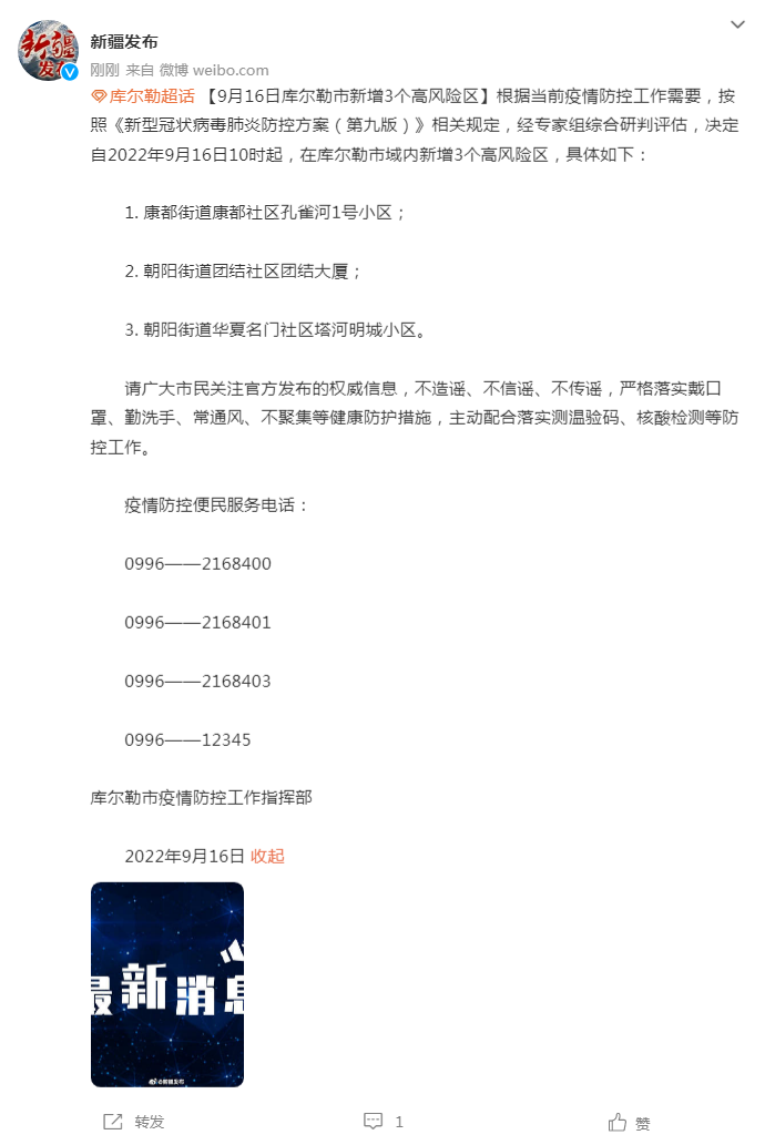 根据当前疫情防控工作需要,按照《新型冠状病毒肺炎防控方案(第九版)》相关规定,经专家组综合研判评估,决定自2022年9月16日10时起,在库尔勒市域内新增3个高风险区,具体如下: