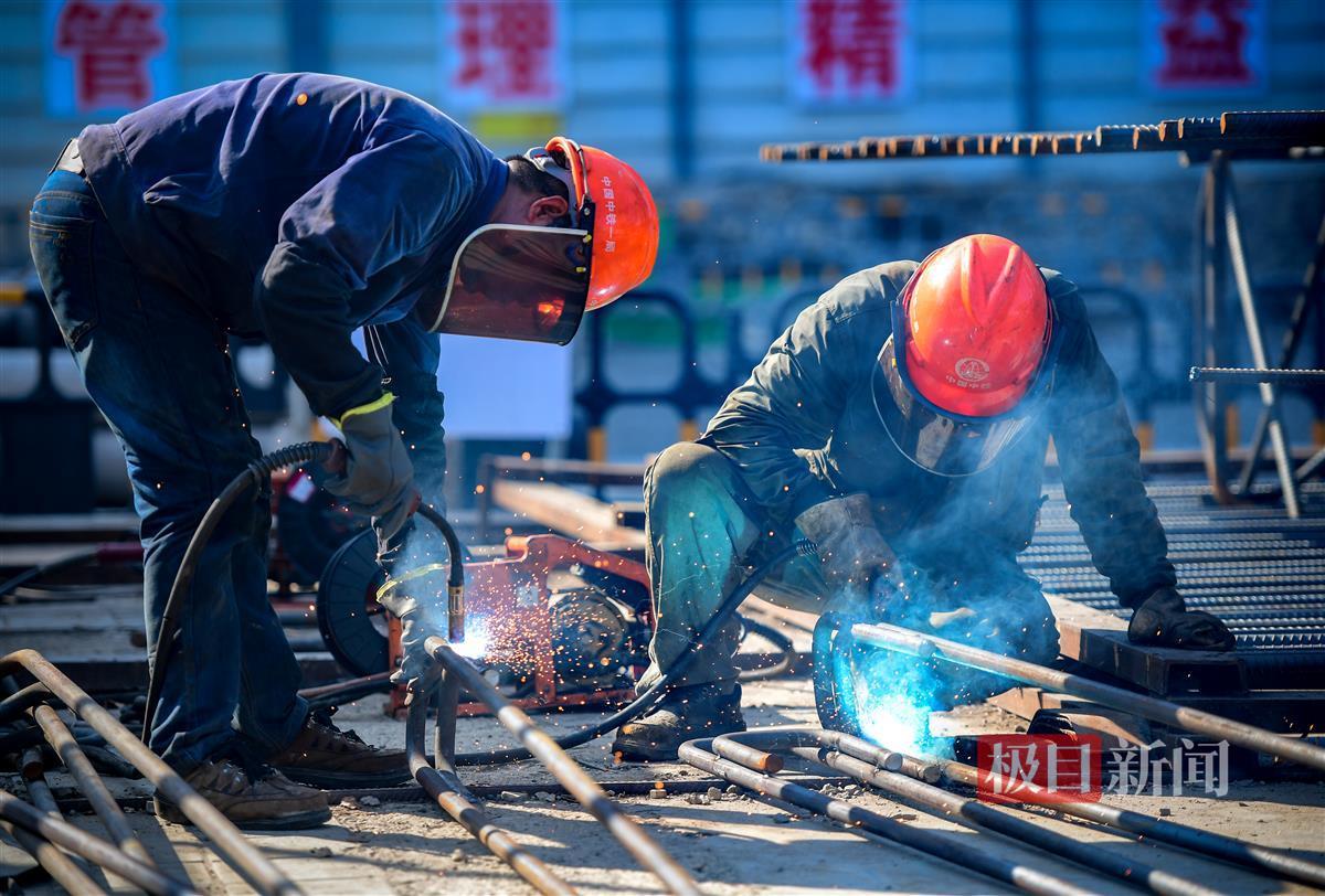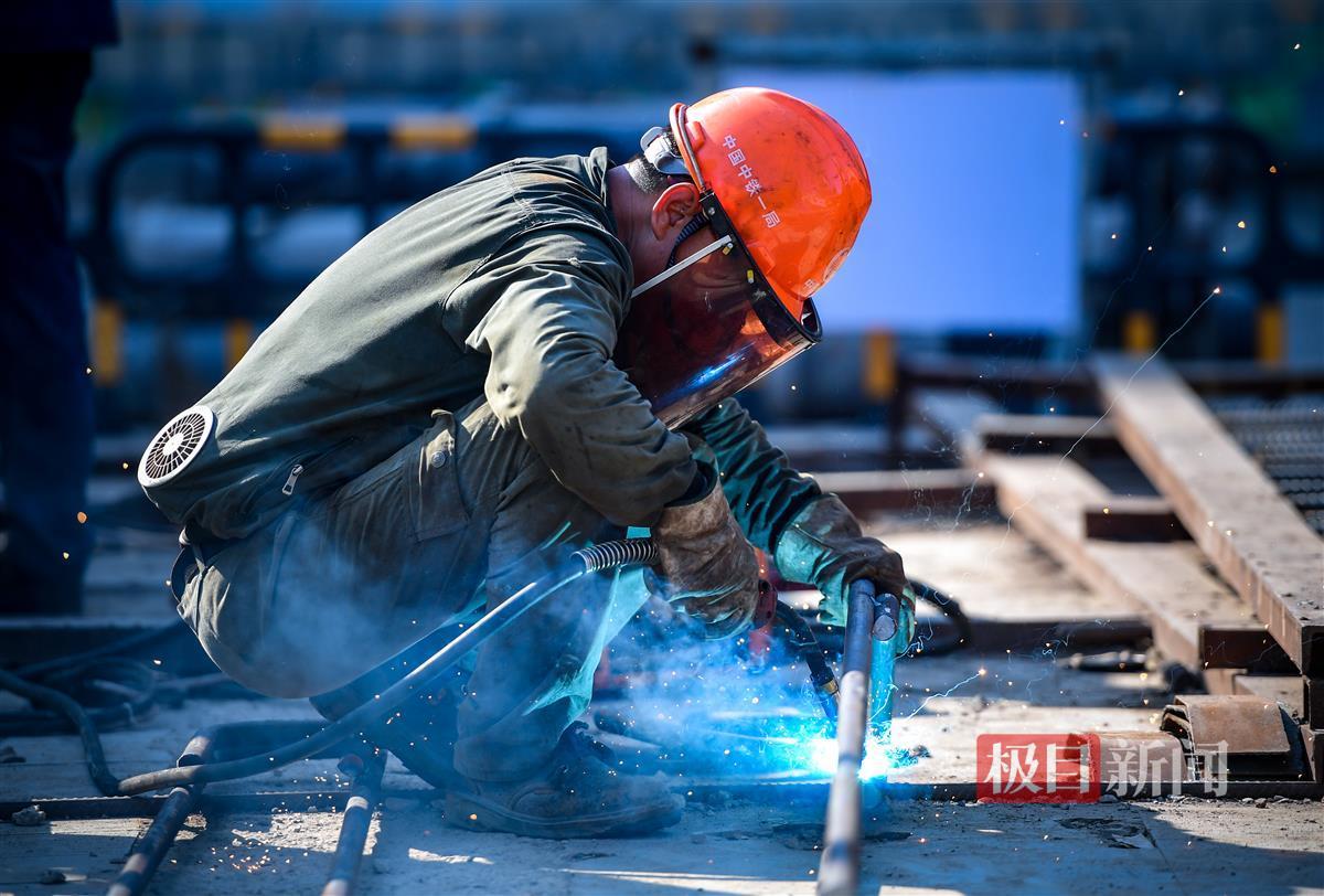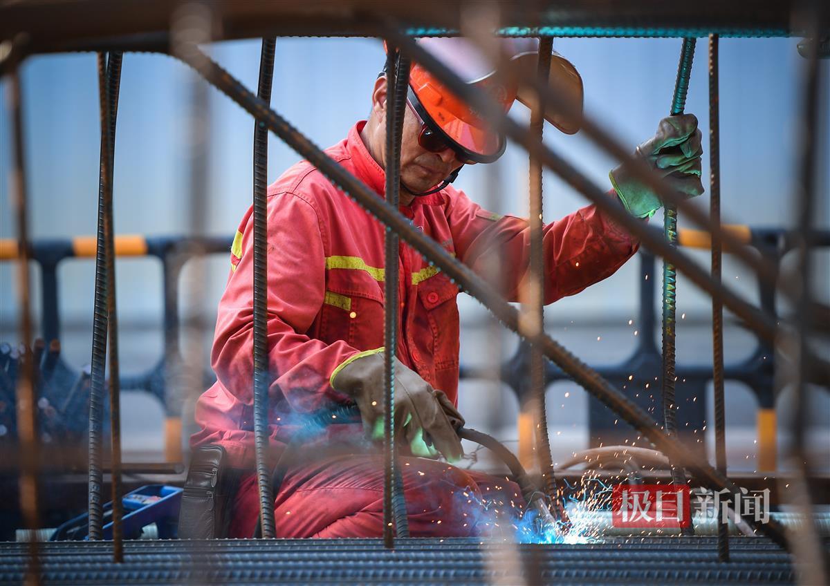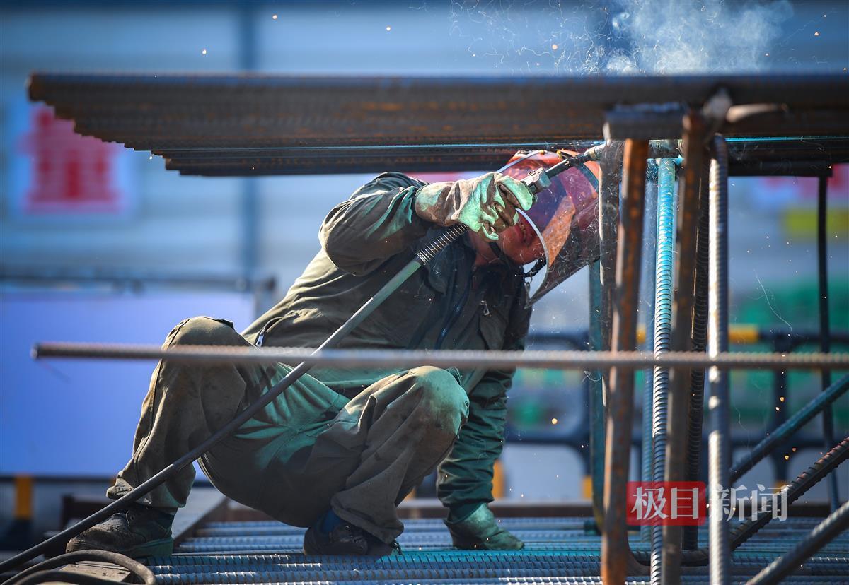 8月21日上午8点30分,在武昌徐东路的中铁一局武汉轨道交通12号线施工现场,工人们头戴安全帽,顶着烈日,手持焊枪,聚精会神地焊接着工地上的钢筋笼。记者发现,早上的太阳不是特别的烈,但工人们的衣服均已湿透。