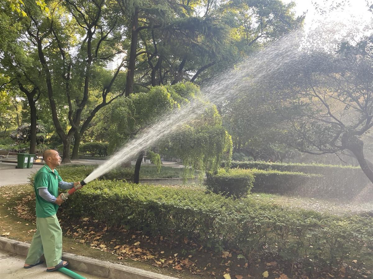 公园大广场附近,冯其贤师傅给植物浇水,同伴帮忙搬移水带,“浇水不轻松不简单,水压大,得用巧劲掌控水龙头。”