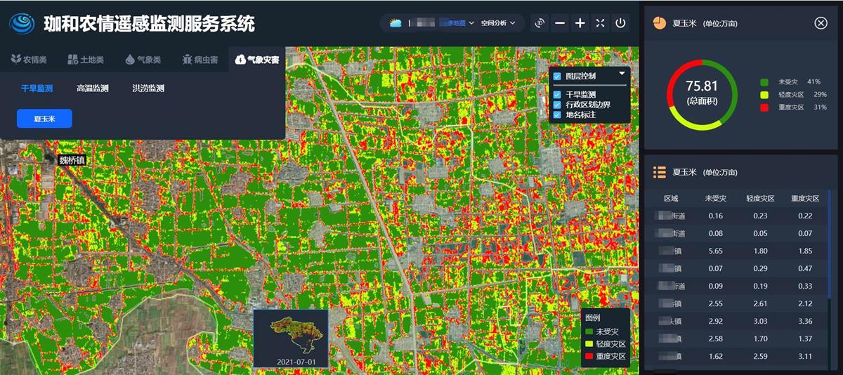 珈和科技技术总监黄杰介绍,他们2015年前后推出了农险遥感服务平台,借力“太空相机”遥感卫星的功能,结合地理信息系统、定位系统、AI算法、气象数据等技术和数据,可以为农业险投保对象“拍画像”,时刻“盯”住它,监测和分析农情数据。