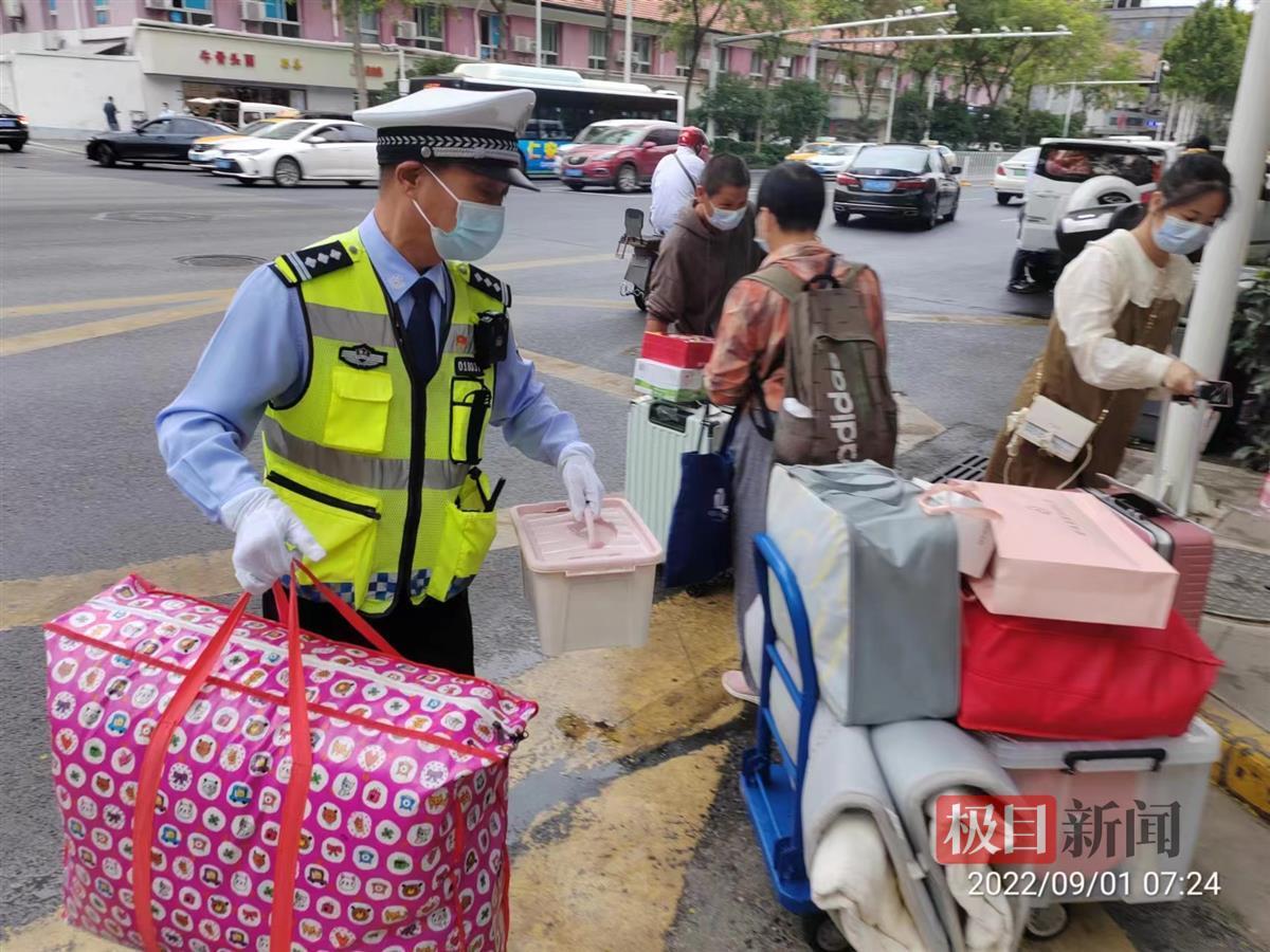 9月1日是中南财经政法大学新生报到注册日,当天上午,在首义校区新生报到点,武昌区公安分局凤凰山派出所民警苏志强、叶沧海、潘艳早早来到现场,设立“治安服务点”,在配合学校做好防疫的同时,维持秩序服务学生,并向新生宣传反电诈、禁毒、防传销等有关常识和户籍业务,推广国家反诈APP,增强学生们的安全防范意识。在首义校区南门,武昌交通大队南站警务区民警刘五桥和同事6时30分就上岗,重新设置交通护栏和反光锥桶,方便送新生的私家车临时停车。见到行李较多的新生,刘五桥还主动上前“搭把手”协助搬运。据了解,武昌警方严格落实开学日民警值守制度,合理调整快反队勤务,加强重点部位守控和巡逻,进一步提高开学期间的见警率和管事率,确保开学季师生、校园平安。