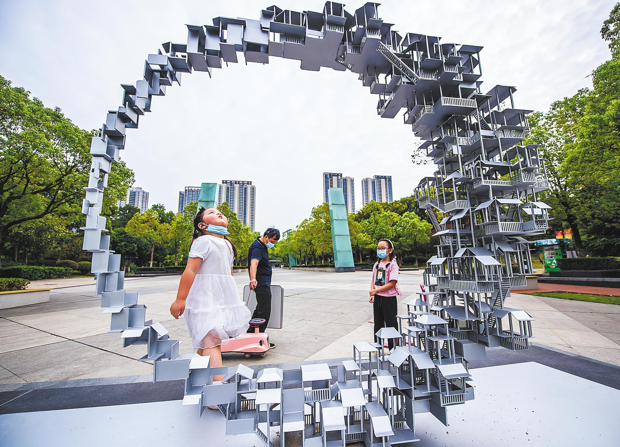 9月4日,武汉汉阳月湖公园凤凰广场中轴线上,矗立着一座“月亮门”型的雕塑——“广寒阙”,引来不少市民游客打卡留影。 这座银光闪闪的雕塑为不锈钢材质,高1.8米。浮雕“广寒阙”是月湖风景区配套设施改造提升建设工程的景观改造项目,取材于中国古典园林中的月亮门。