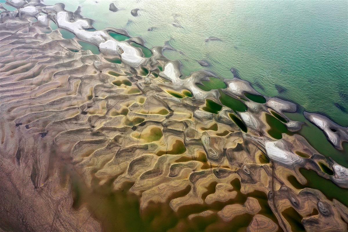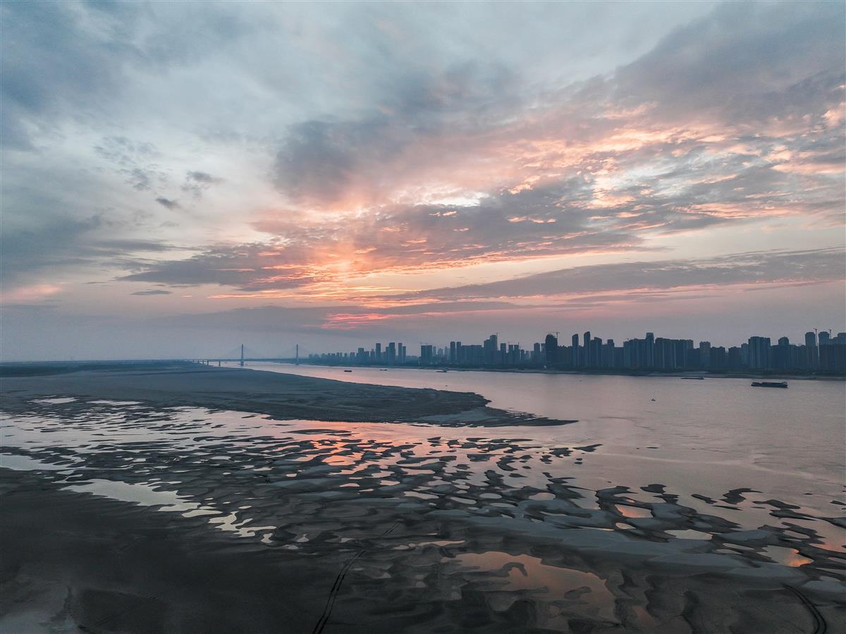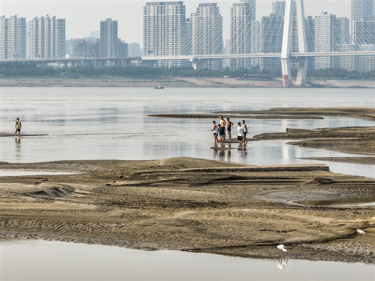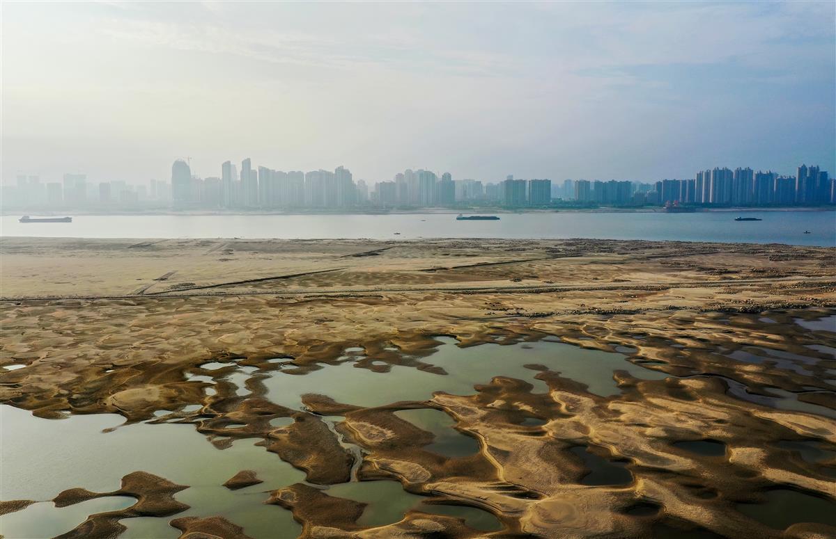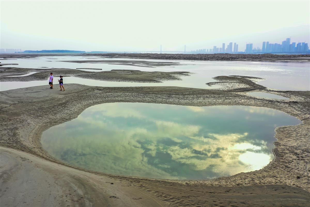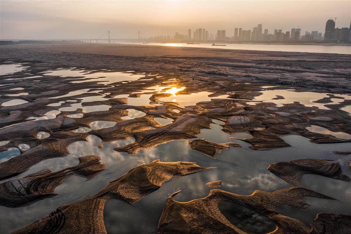 今年长江进入主汛期后水位持续退落,出现了“汛期反枯”的罕见现象。连日来,长江武汉段水位继续下探,据长江水文网实时数据显示,截至11日10时,长江汉口站水位仅为13.83米,较往年同期偏低约9米,江边大片滩涂裸露,从空中俯瞰,这些裸露区域呈现出大小不一的坑洼,沙坑连绵颇具美感,引得不少市民前往观看。
