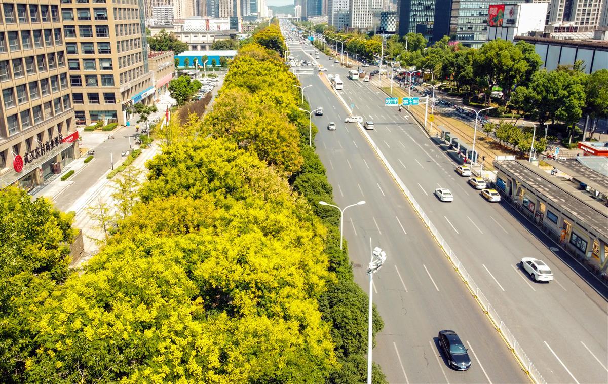 今日(11日),极目新闻记者路过武汉关山大道,栾树满树金花,从空中俯瞰,它们牵手连成金丝带,与绿化带深绿底色相映衬,特别醒目。