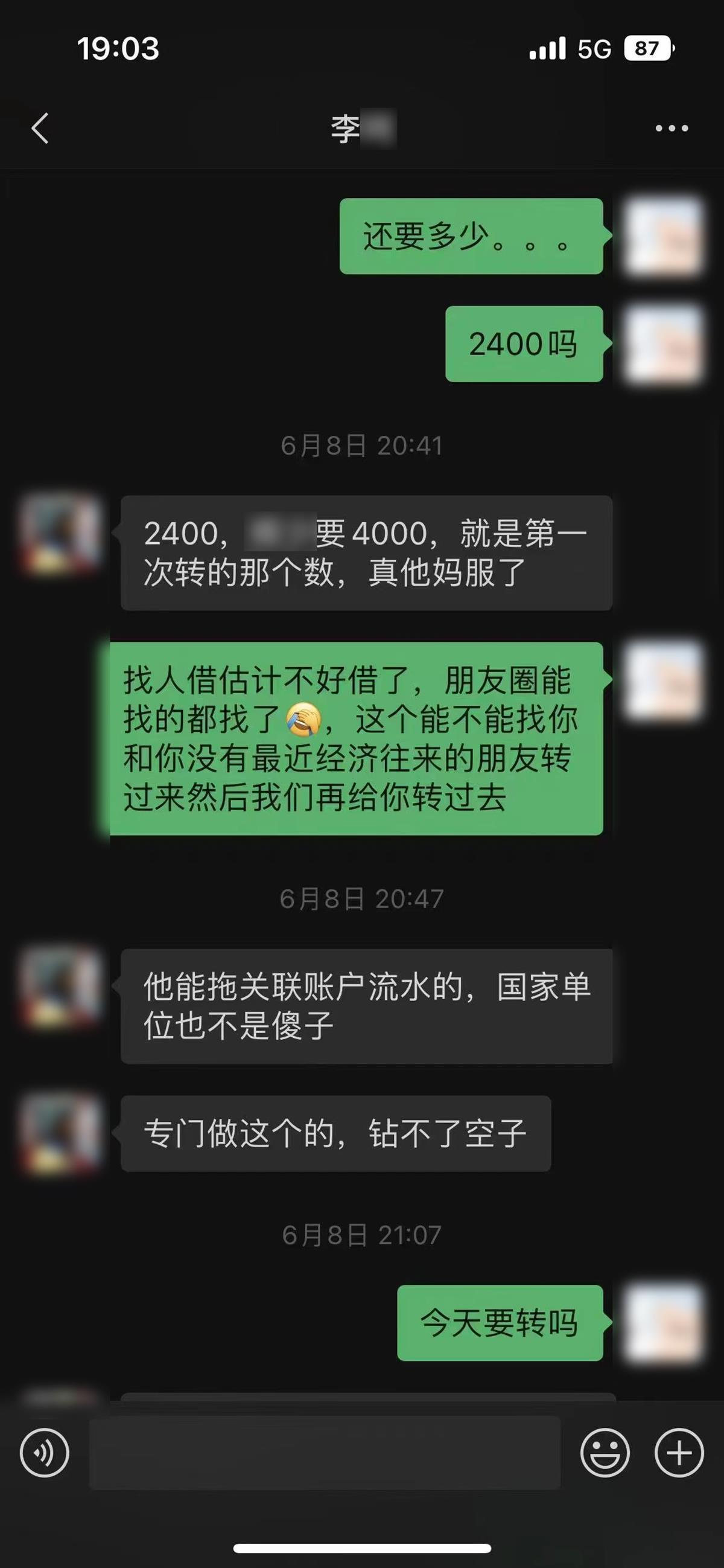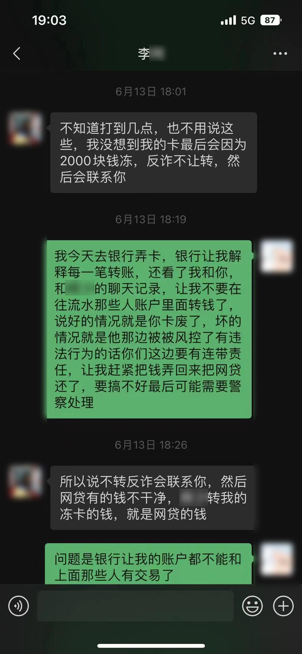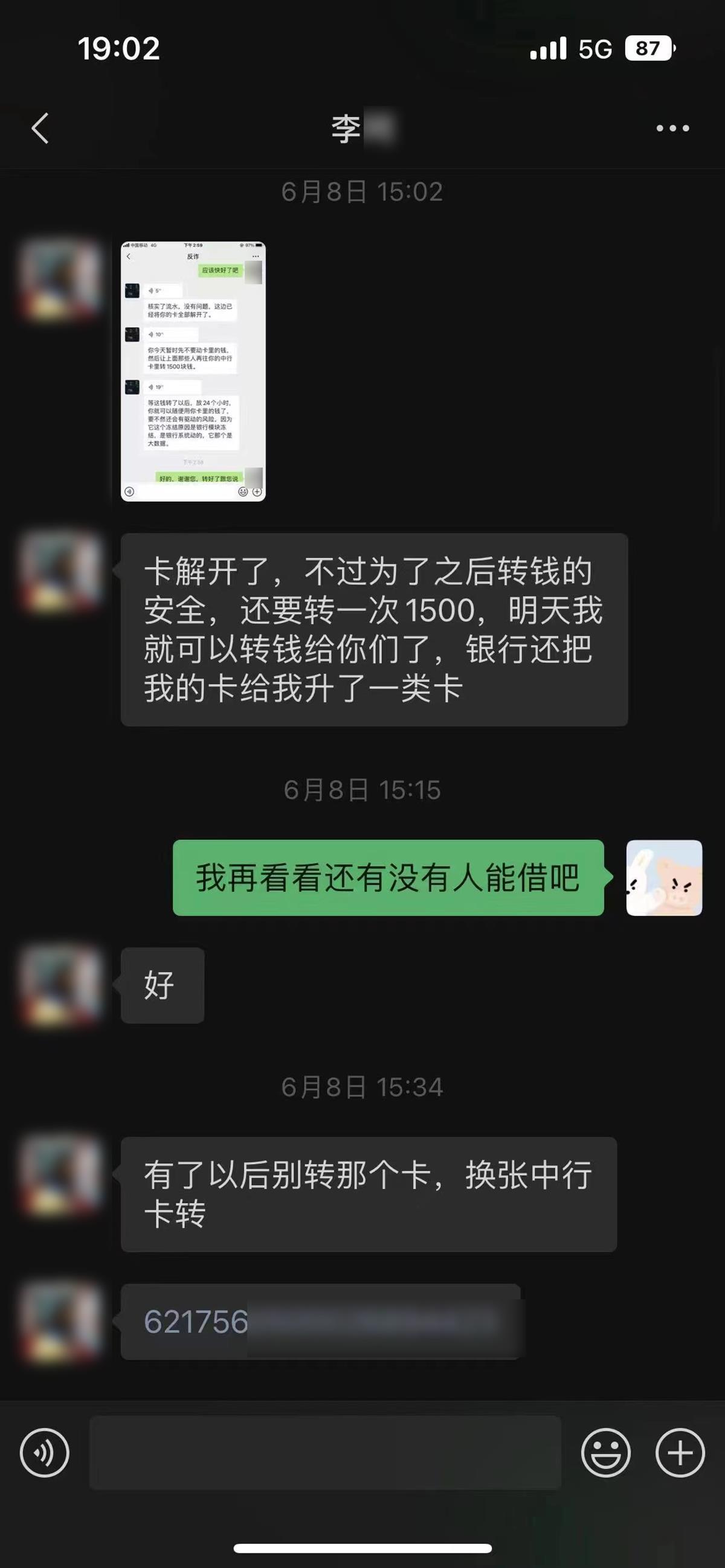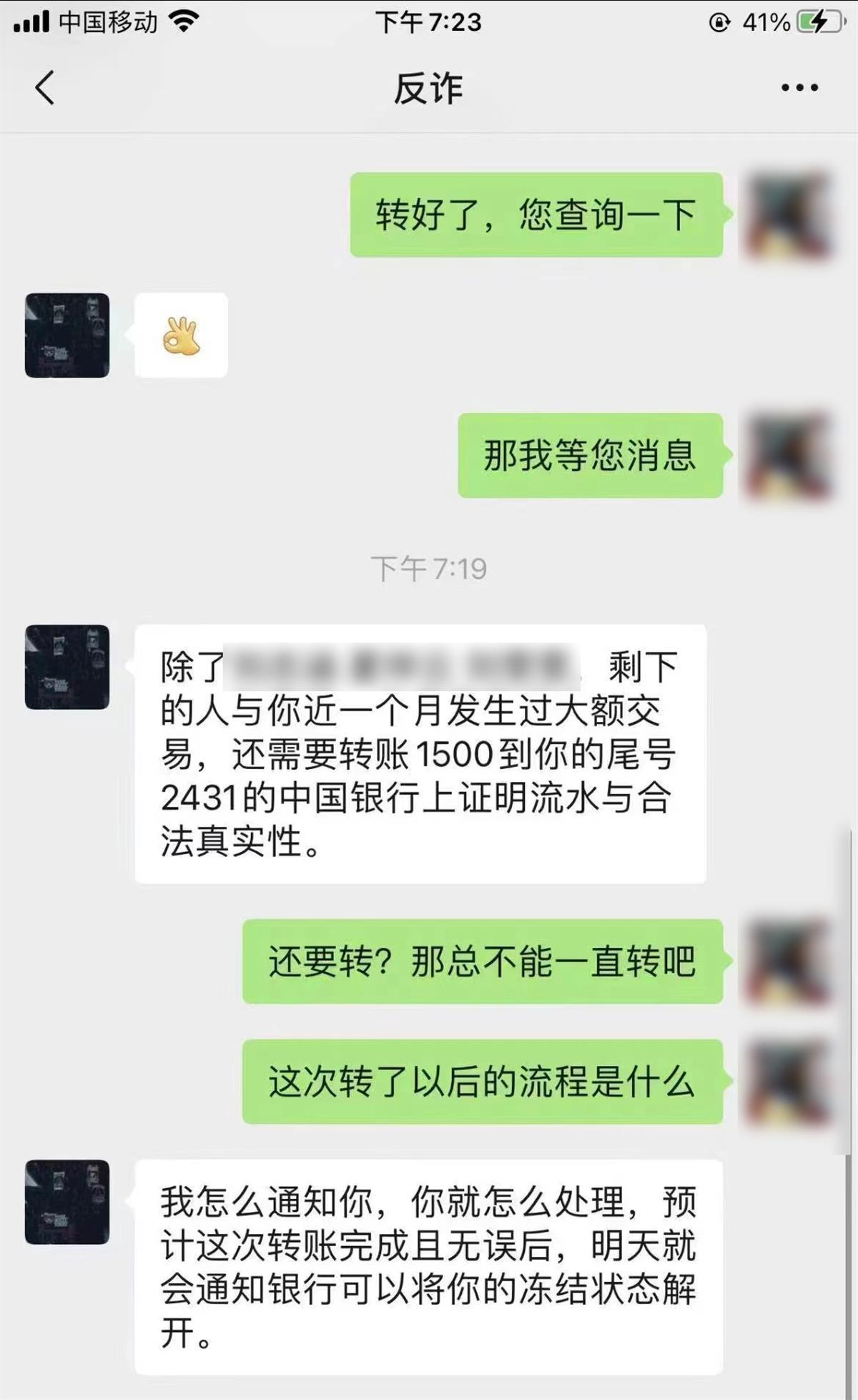 “我被一个熟人骗了近2万元钱!”7月18日晚,市民肖先生急匆匆地来到洪山区马房山派出所报案。他介绍,自己去年底在饭桌上认识的朋友李某于今年5月突然称其银行卡被冻结,找自己借钱应急。出于对朋友的信任,肖先生先后2次共转款5000元。6月13日,李某告诉肖先生,自己的银行卡是因为涉及电信网络诈骗,才被警方冻结的,需要熟悉的朋友向他被冻结的银行卡转账1500元以验证资金流水的真实性,说完还将自己和“反诈民警”的聊天记录截图发给肖先生。