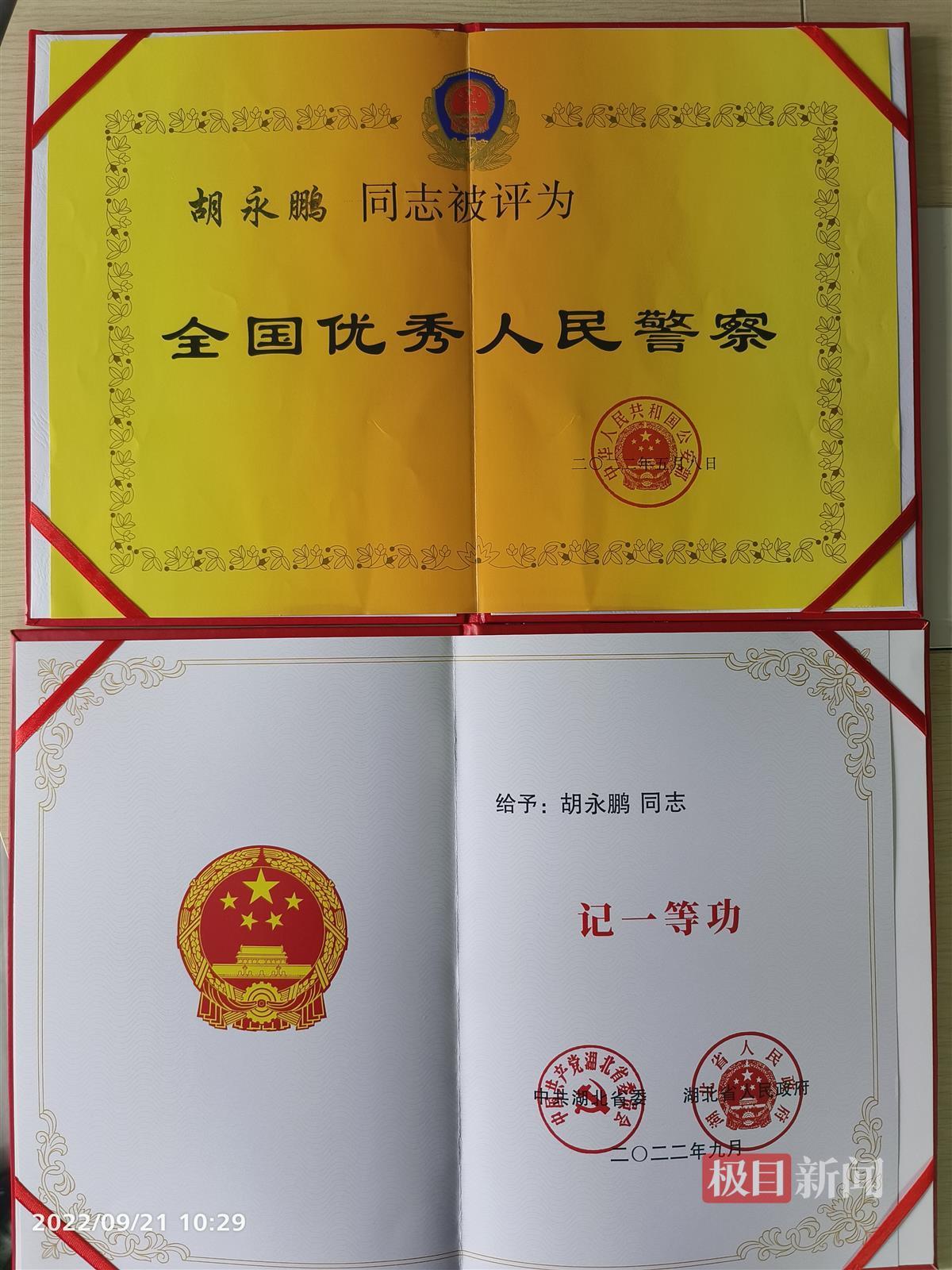今年4月26日,“光耀新时代 共同向未来——2021‘荆楚楷模’年度人物发布仪式”在武汉举行,胡永鹏等9位个人和1个集体光荣当选2021“荆楚楷模”年度人物。5月25日,公安部集中表彰一批先进单位和个人,胡永鹏荣获“全国优秀人民警察”荣誉称号。
