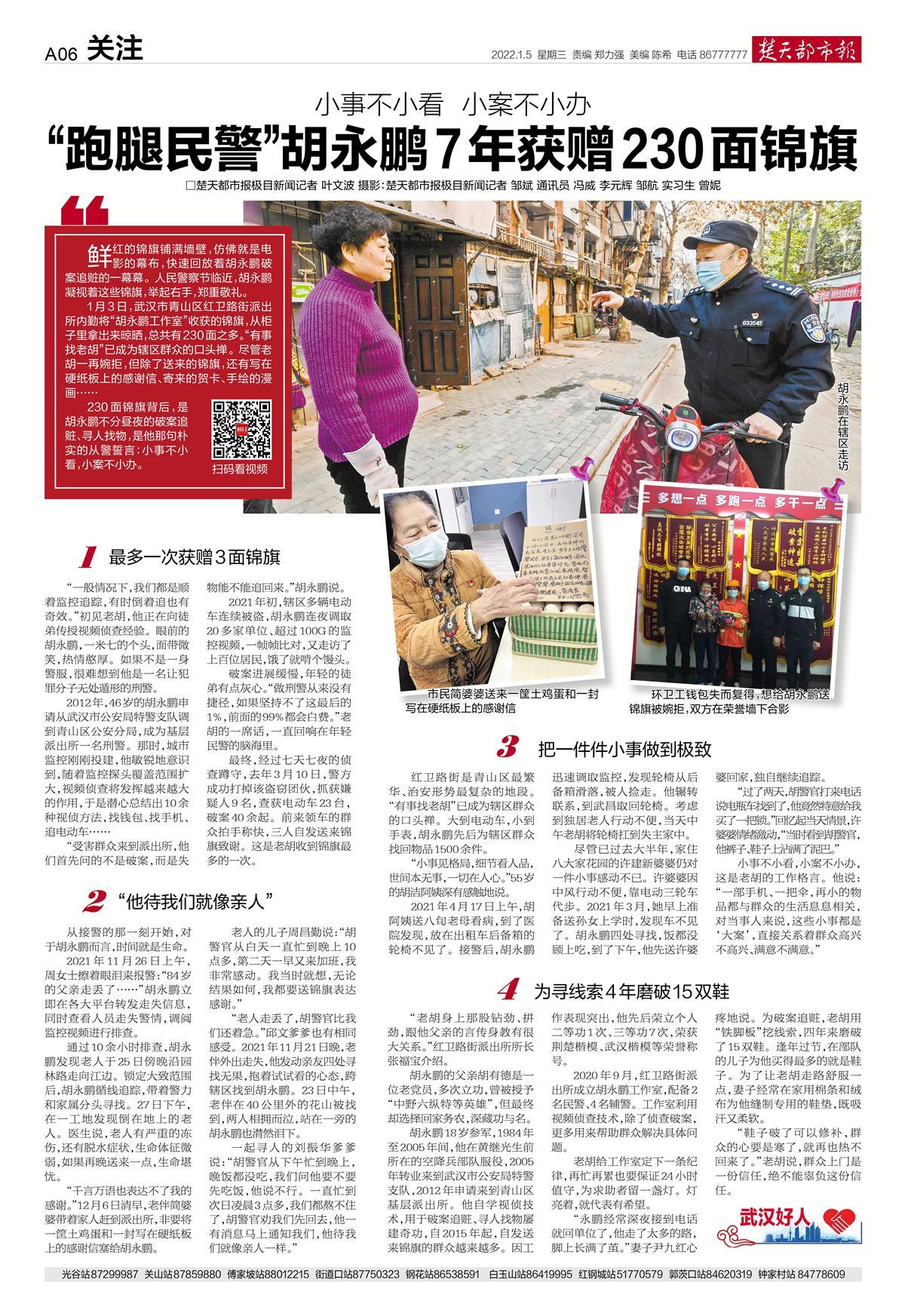 尽管老胡一再婉拒,但除了送来的锦旗,还有群众写在硬纸板上的感谢信、寄来的贺卡、手绘的漫画……7年获赠230面锦旗背后,是胡永鹏不分昼夜的破案追赃、寻人找物,是他那句朴实的从警誓言:小事不小看,小案不小办。