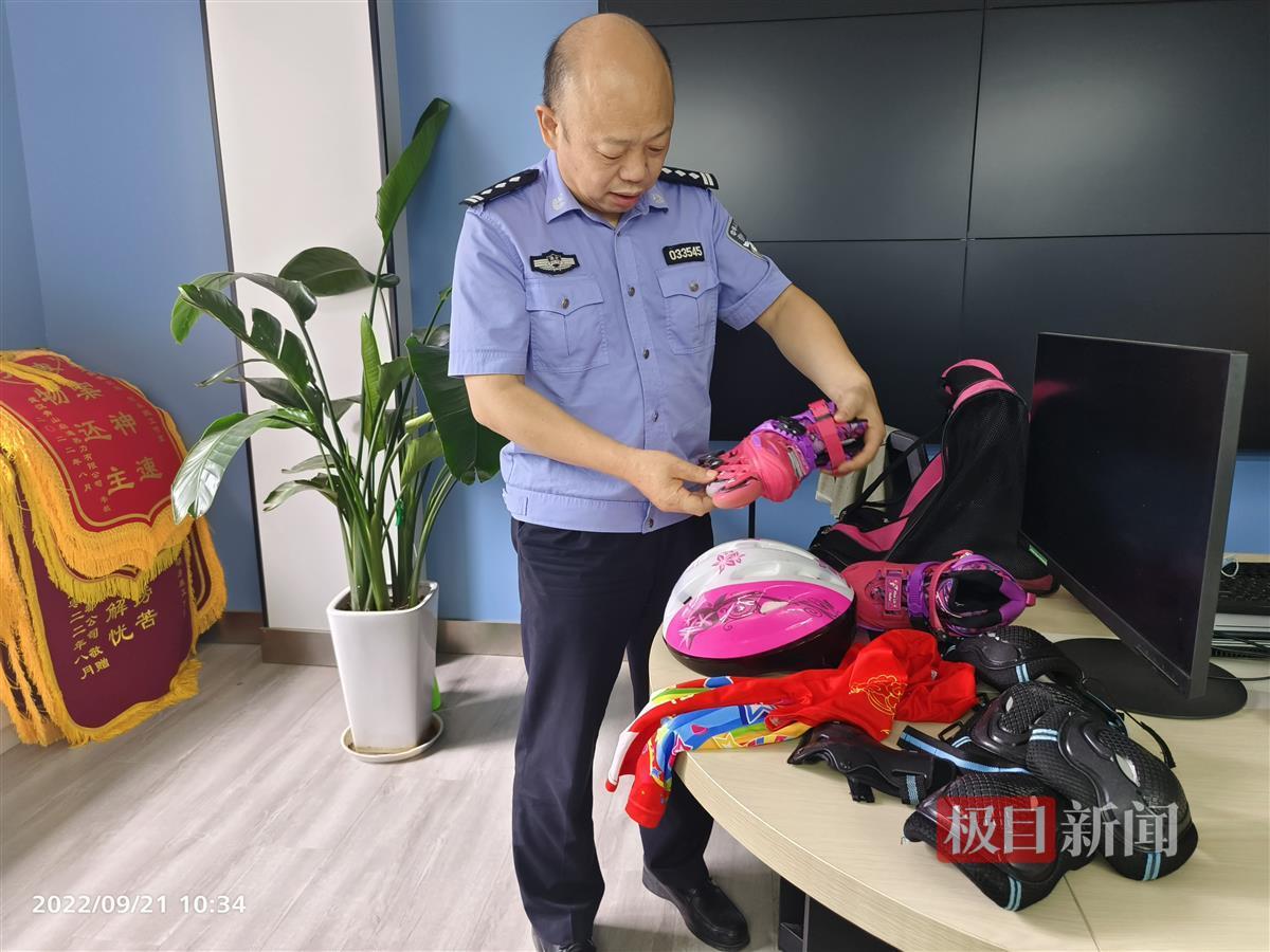 胡永鹏是武汉市公安局青山区分局(钢城分局)红卫路街派出所民警。9月21日上午,极目新闻记者来到红卫路街派出所“胡永鹏工作室”,他正在帮群众寻找失物,忙得不亦乐乎。很快,工作室辅警在老胡的带领下,找到捡背包的爹爹,将一名小女孩的整套溜冰设备全部追回。“有溜冰鞋,有头盔,有手套……”胡永鹏一边整理,一边说道。
