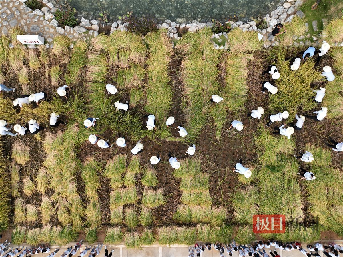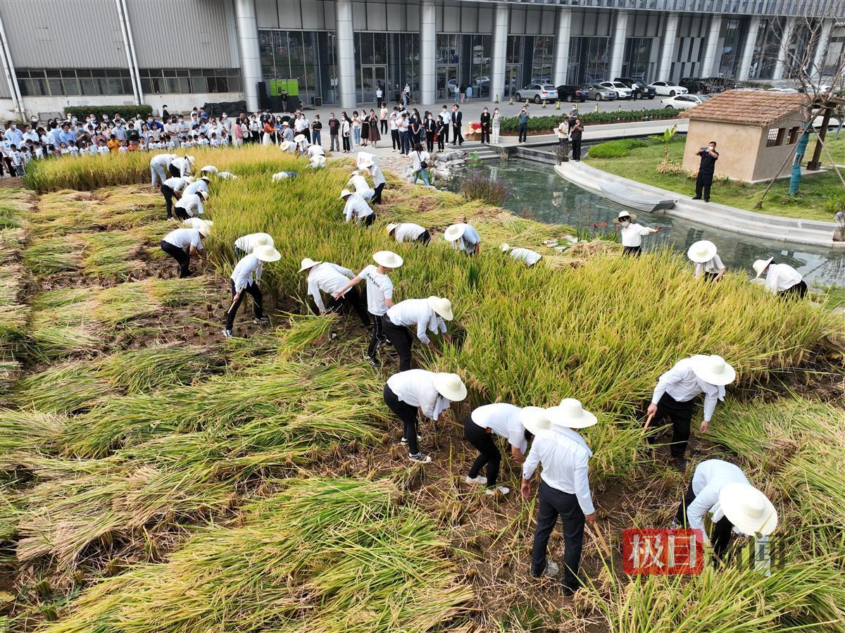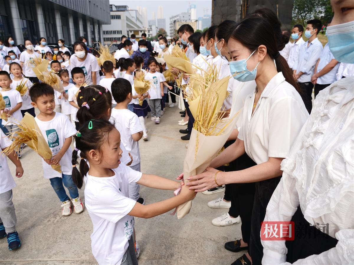 收割水稻的活动,还吸引了附近华中师范大学附属天成美景幼儿园的小朋友们,这些孩子曾在7月到共耘田里拔过草,而今水稻成熟,他们也来见证收获的时刻,并将一束束象征荣誉的稻穗,献给劳动模范。