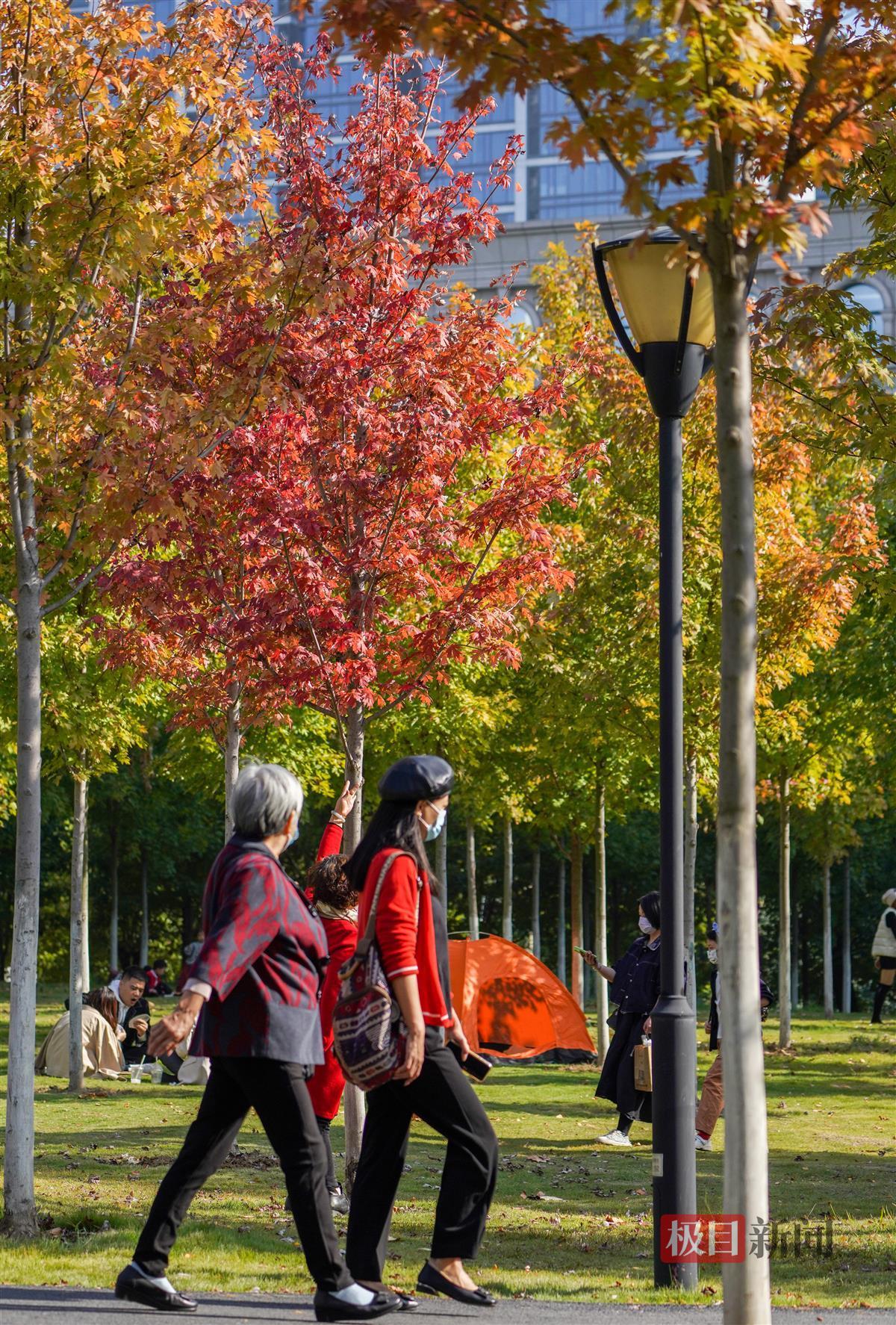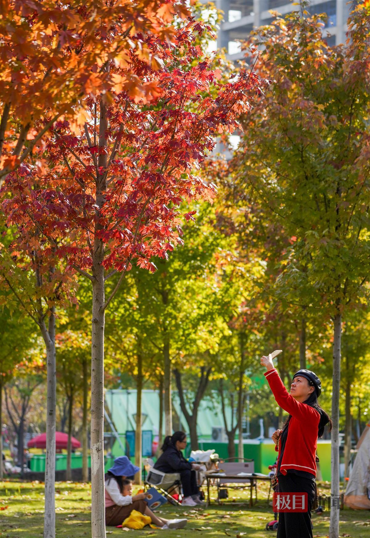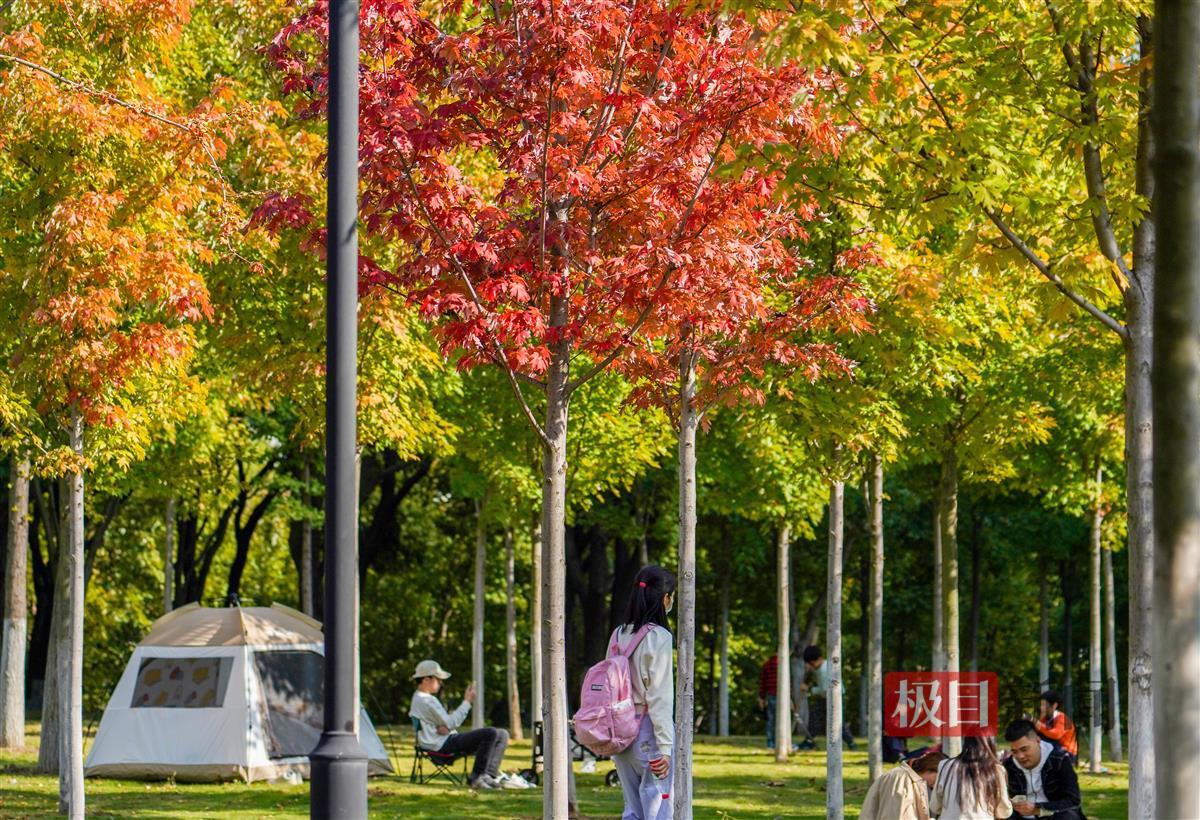 记者当天下午现场看到,约有上百株枫树的这一片枫林位于公园C区入口右侧,整片林子近三成的叶子已变红,不少入园游玩的市民纷纷拍照打卡,有的甚至在林间支起帐篷享受秋日的暖阳。