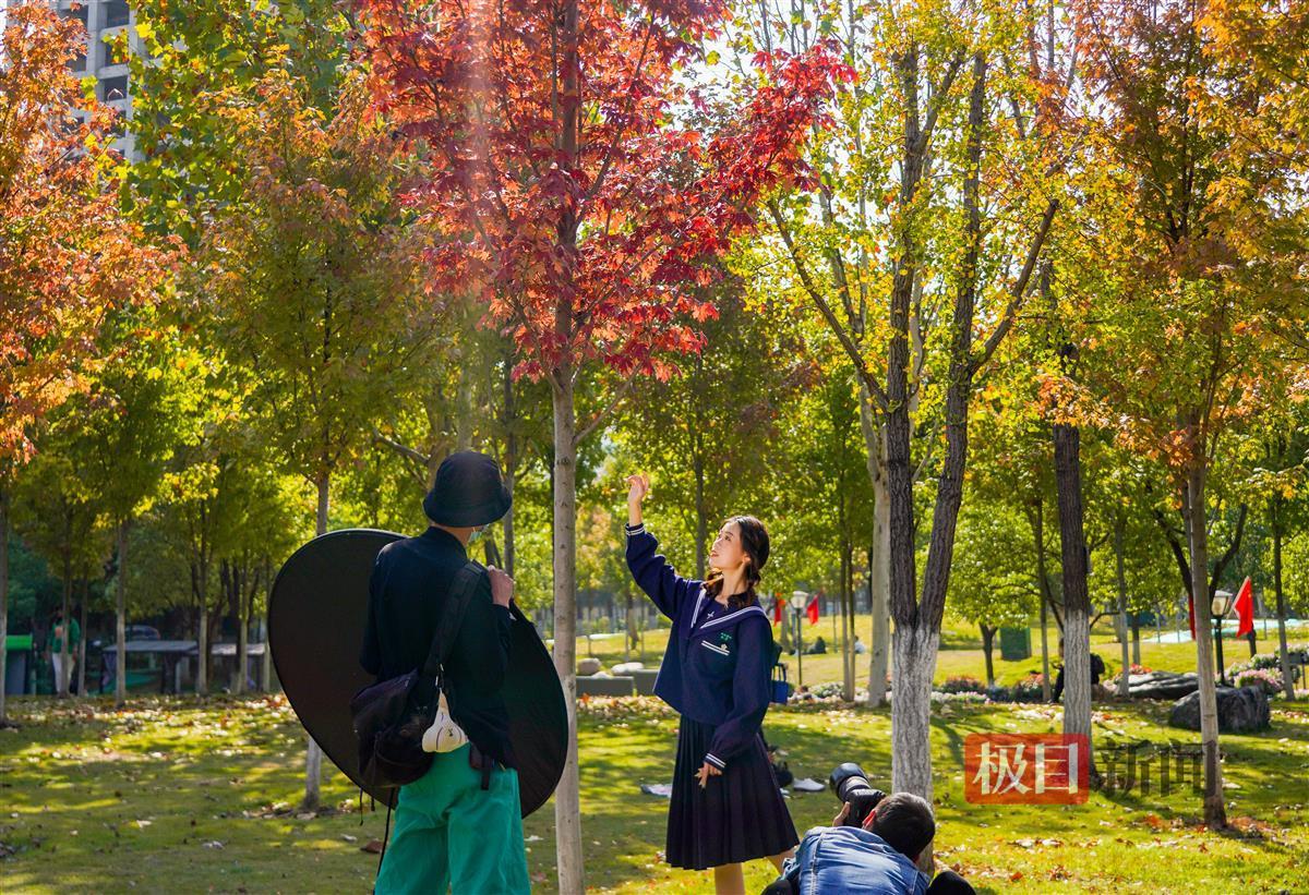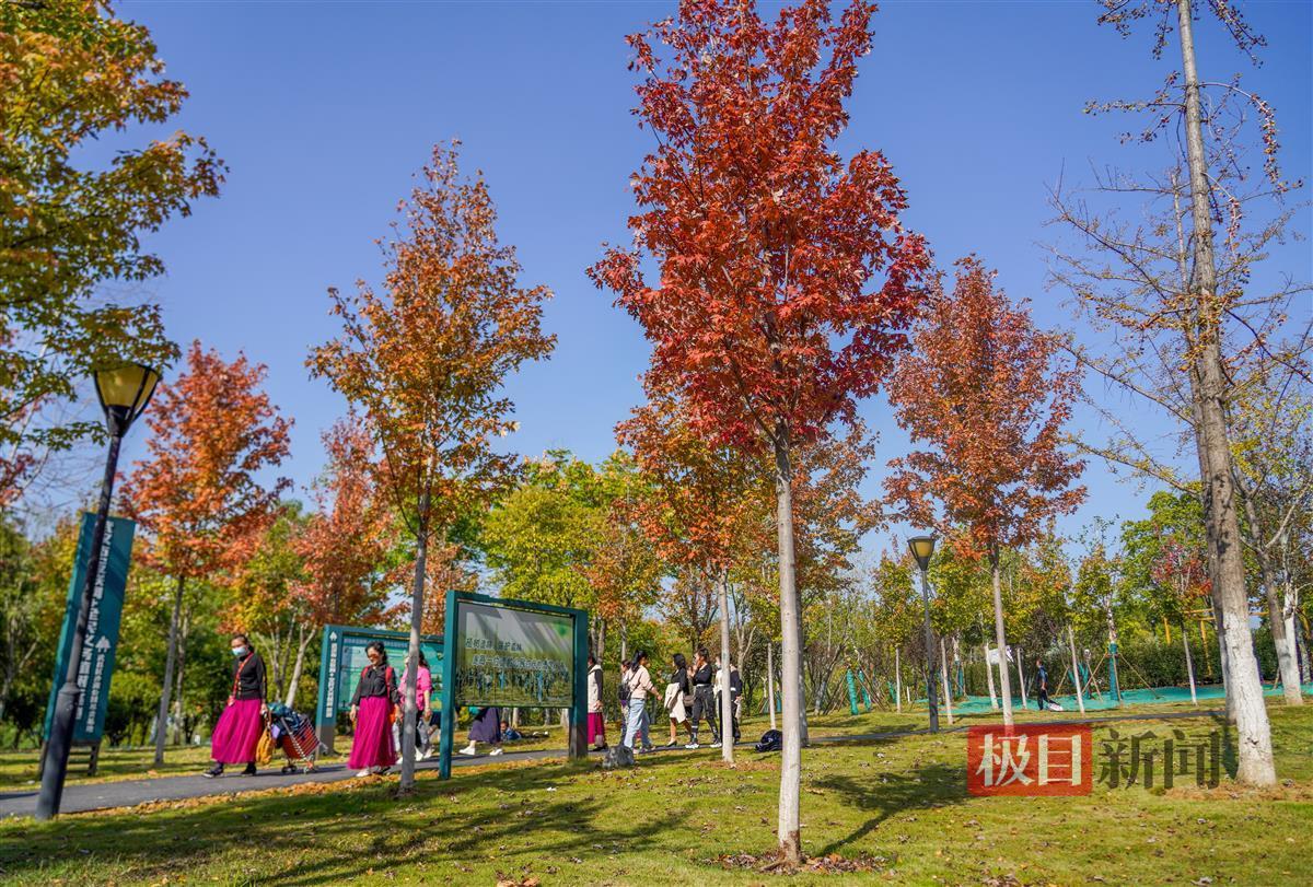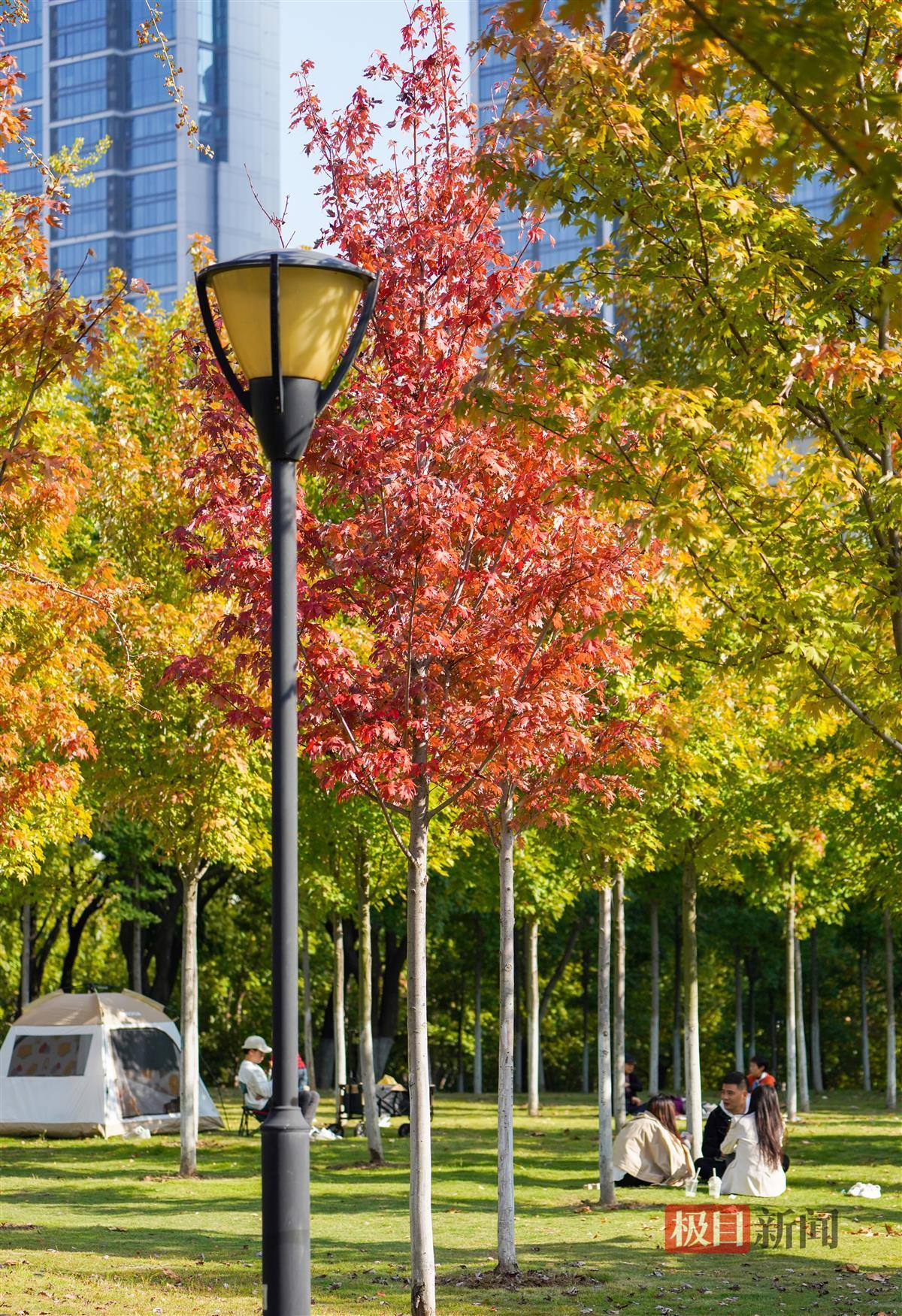 记者当天下午现场看到,约有上百株枫树的这一片枫林位于公园C区入口右侧,整片林子近三成的叶子已变红,不少入园游玩的市民纷纷拍照打卡,有的甚至在林间支起帐篷享受秋日的暖阳。