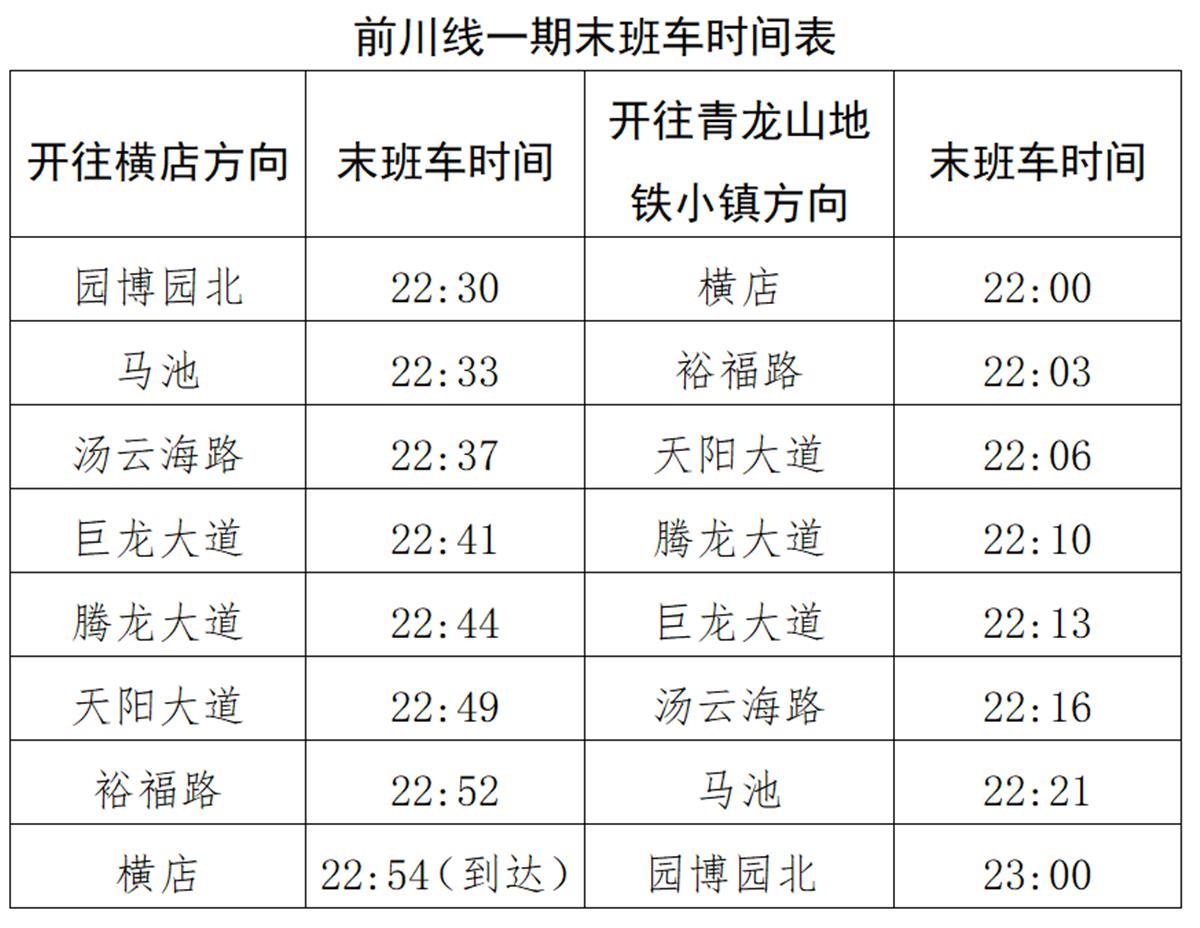 为了高效运营和科学调度,前川线一期与7号线贯通运营后,全线按照大小交路1:1组织运营。大交路为横店站至青龙山地铁小镇站,全周转(列车跑一圈)时间为196分钟;小交路为巨龙大道站至板桥站,全周转(列车跑一圈)时间为123分钟。7号线(含前川线一期)末班车时间如下:22时,横店站开往青龙山地铁小镇站末班车发出;22时30分,园博园北站开往横店方向末班车发出;23时,园博园北站开往青龙山地铁小镇站末班车、青龙山地铁小镇站开往园博园北站末班车同步发出。