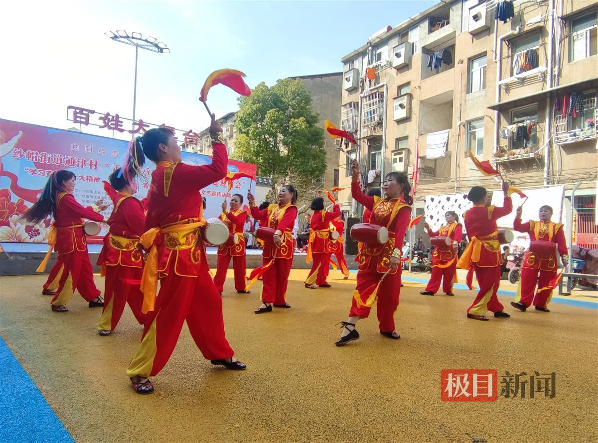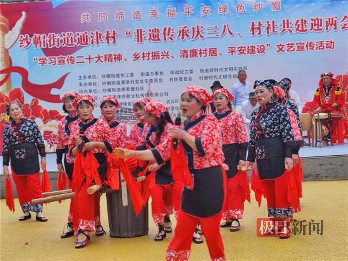 3月6日,武汉经开区纱帽街道通津村与廖家堡社区共同举办文化活动,庆祝“三八”国际妇女节,致敬每一位了不起的“她”。活动现场,武汉市非物质文化遗产“通津夯歌”等节目演出,赢得观众的阵阵掌声。