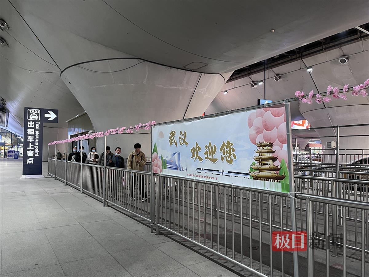 阳春三月,武汉樱花盛开,武汉火车站也迎来了赏樱客流。近日,细心的旅客会发现,在武汉火车站出租车候乘处栏杆上,新增了樱花藤条装饰,满满的春意让舟车劳顿的旅客出站便能感受武汉的樱花氛围。