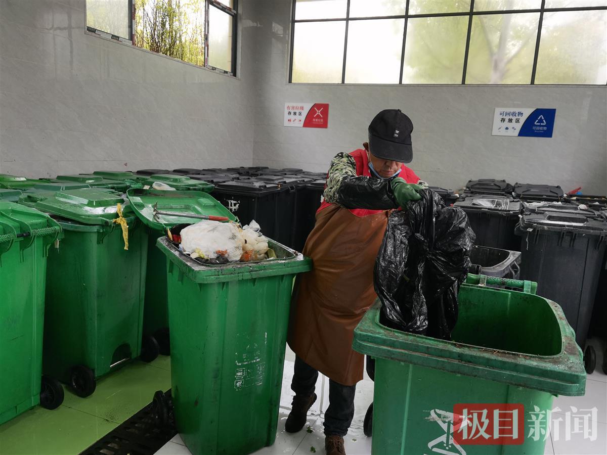 “这些是从汉荣苑小区拖过来的。”肖师傅一边说,一边破袋检查里面的垃圾,“如果发现其他垃圾,就得重新分类,丢进垃圾一旁的黑色垃圾桶(装其他垃圾)内。”