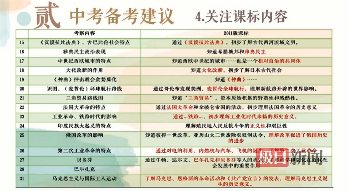 历史科目已有十年时间未被纳入中考考查范围中,2023年武汉市历史的“新中考”将会采取闭卷形式,分值变为60分。题型分为单选题(28分)和材料题(32分),材料题中包括一个10分全开放性的题目。考察范围也会更广泛,如中国古代史将会纳入考察。考试时间“政史”合卷共120分钟。王巍老师表示:中高考正逐渐接轨,试题的灵活性和开放性都在增强,由以往的“考知识”向“考能力”转变。这也是对学生多角度思考问题能力的考查,避免以往的死记硬背所带来的负面影响。