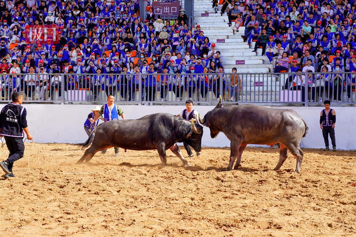 4月29日,“五一”黄金周首日,武汉市新洲区仓埠街紫薇都市田园乡村斗牛节的号角正式吹响,苗族表演者身着盛装欢聚一堂,在舞蹈和芦笙曲中,一场精彩绝伦的斗牛比赛正在上演。