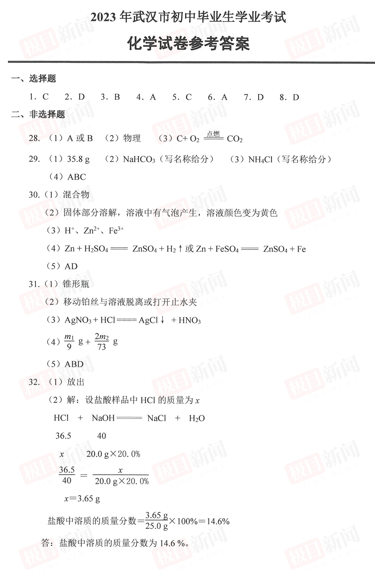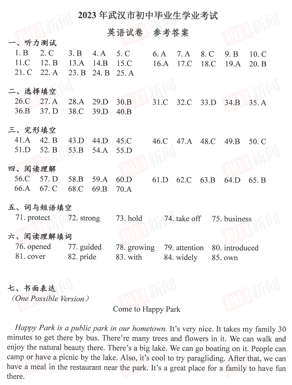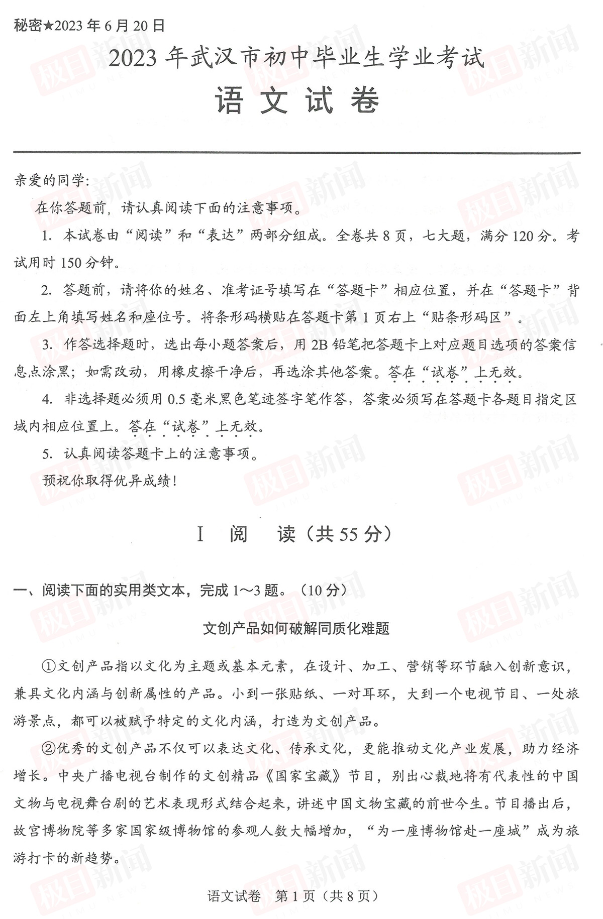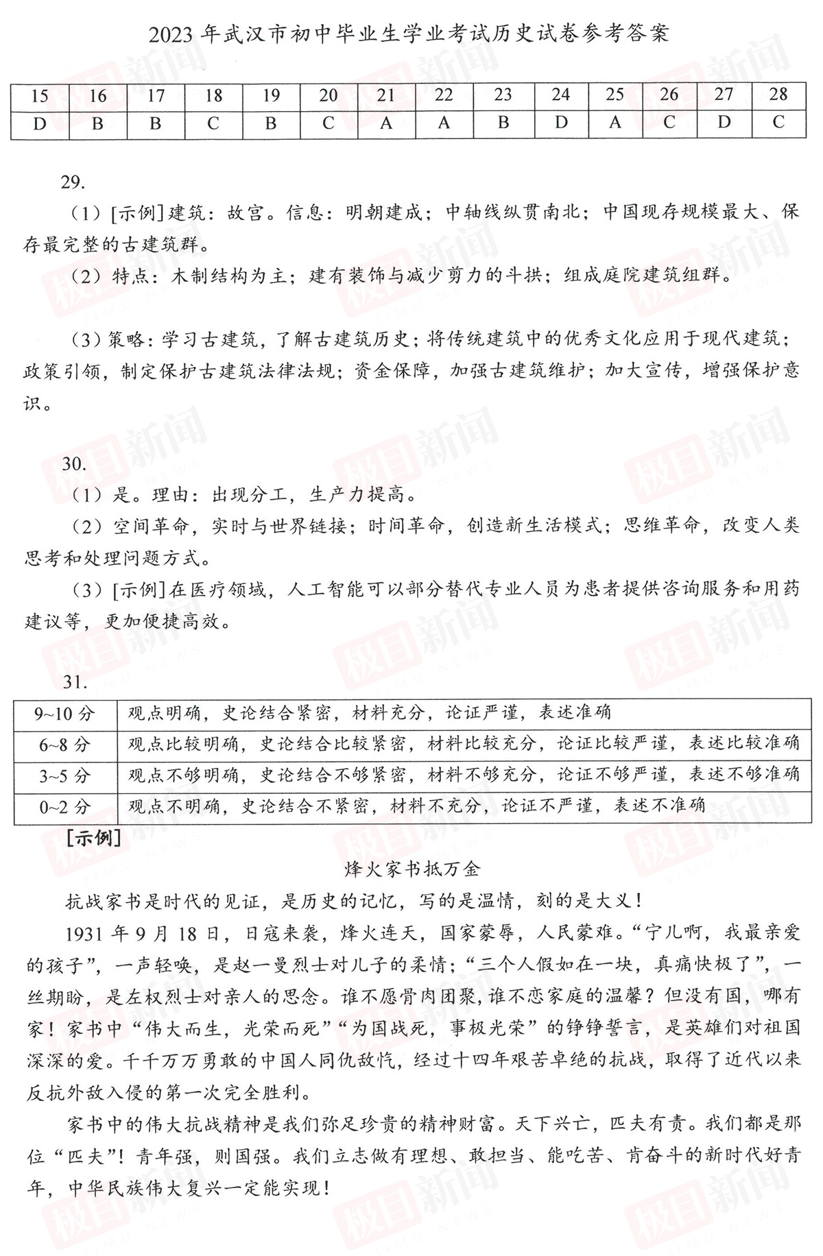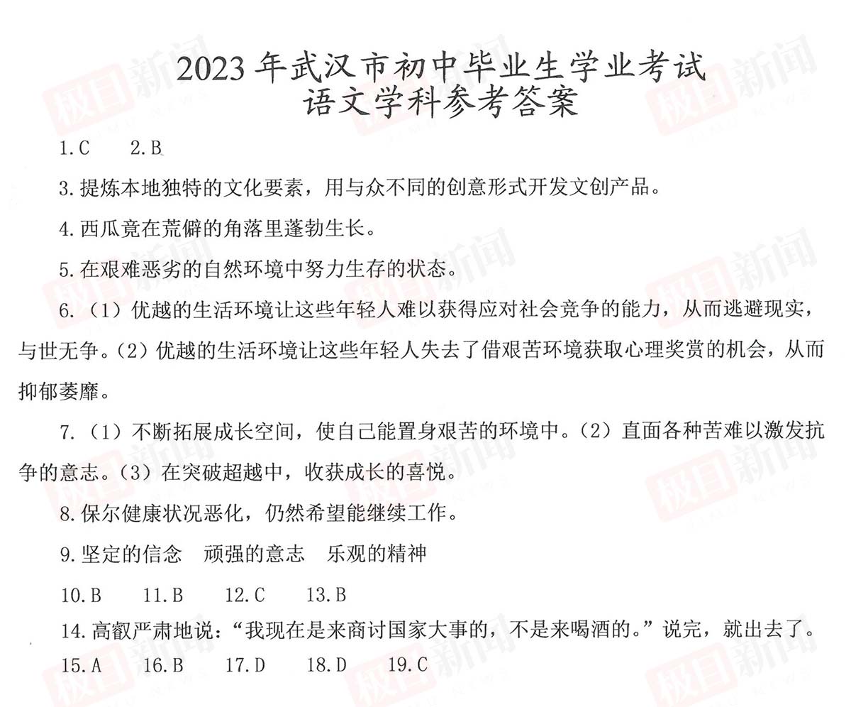 6月22日,2023年武汉中考试卷和参考答案公布。