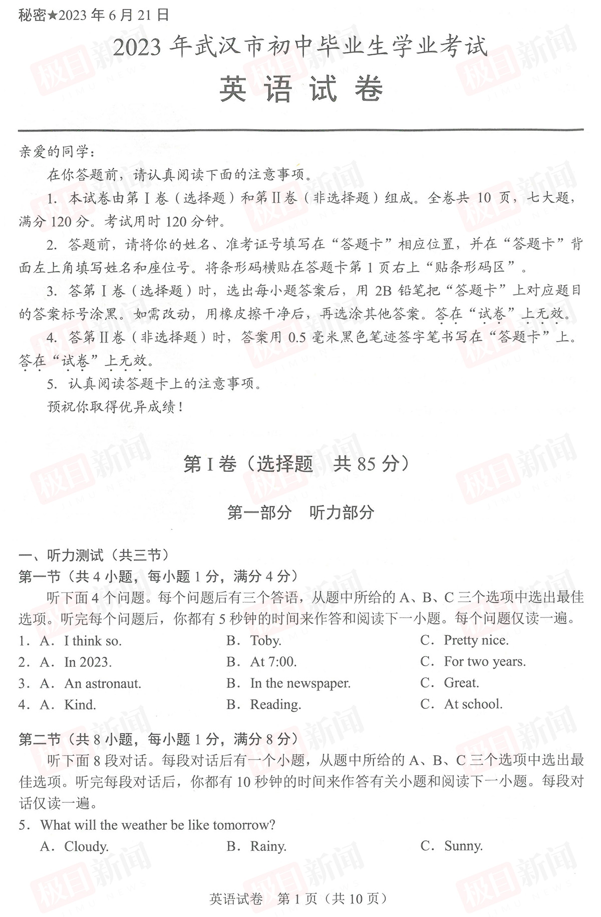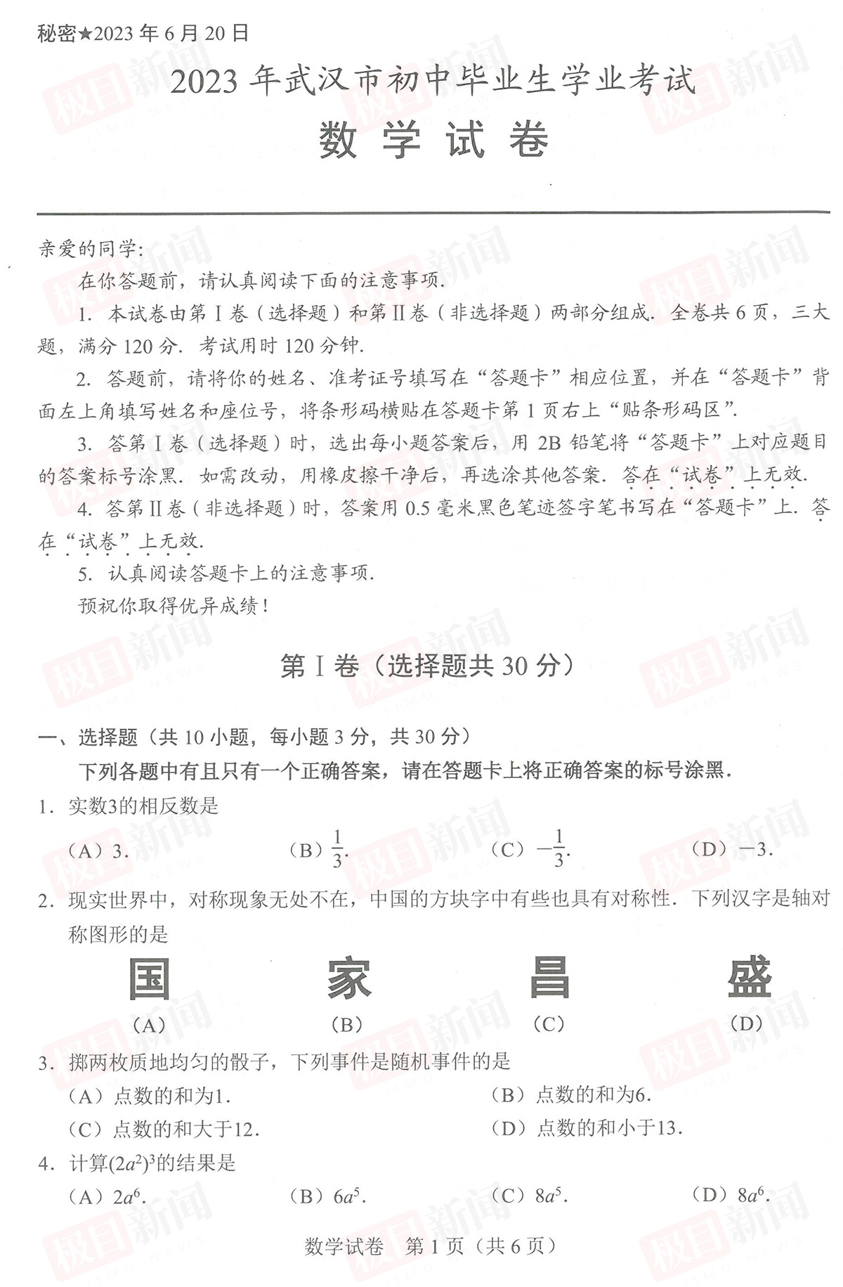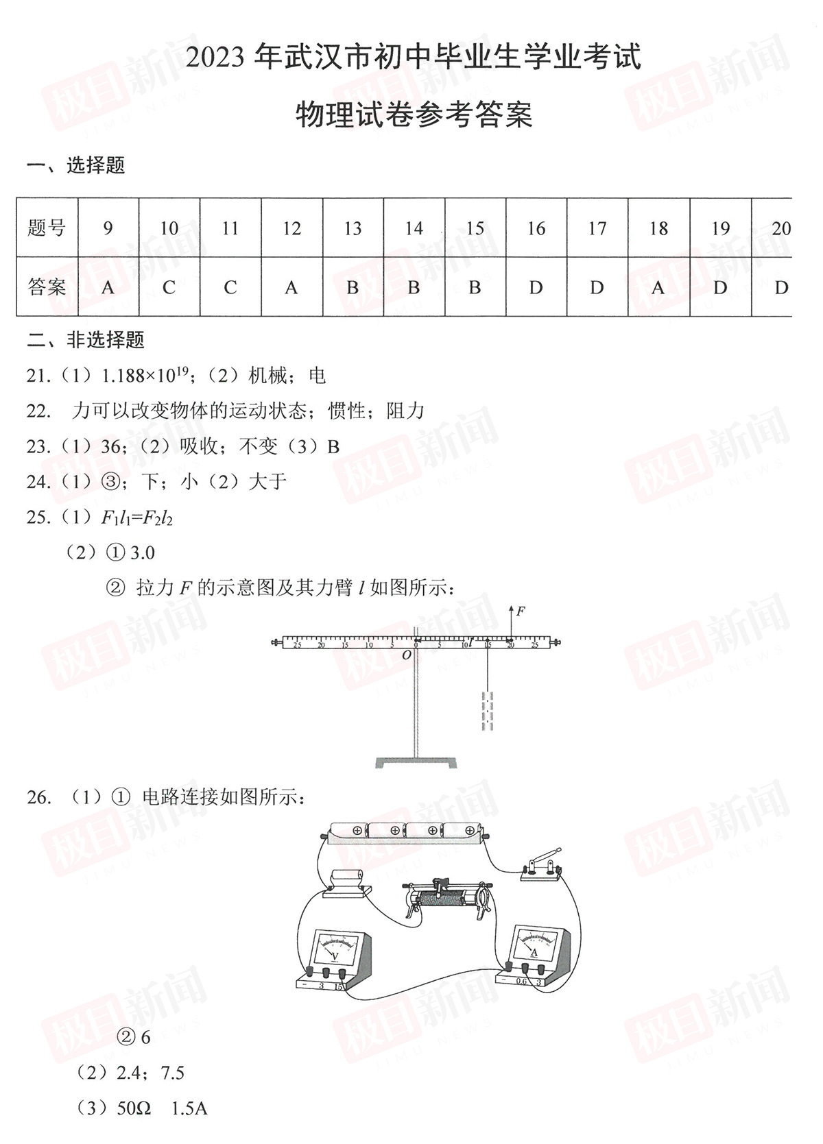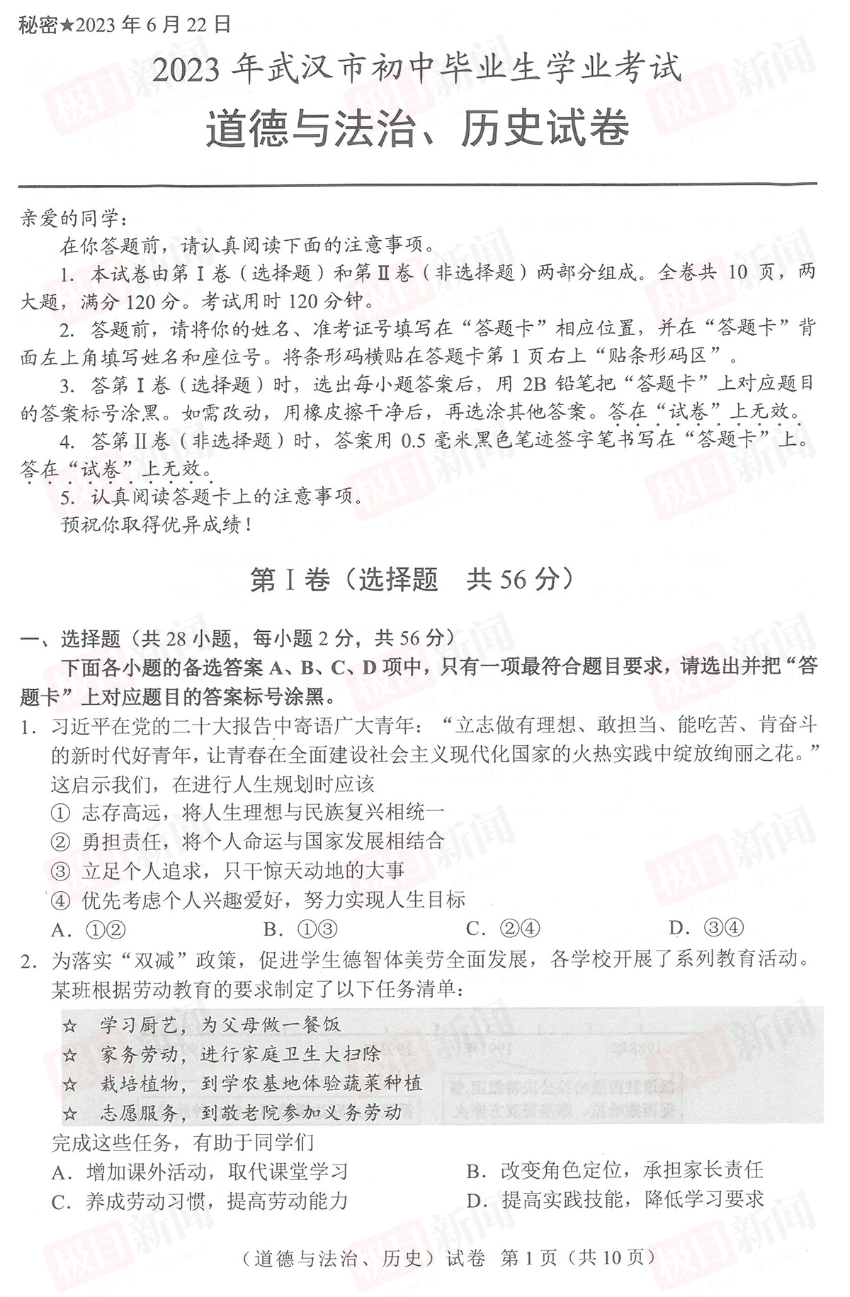 6月22日,2023年武汉中考试卷和参考答案公布。