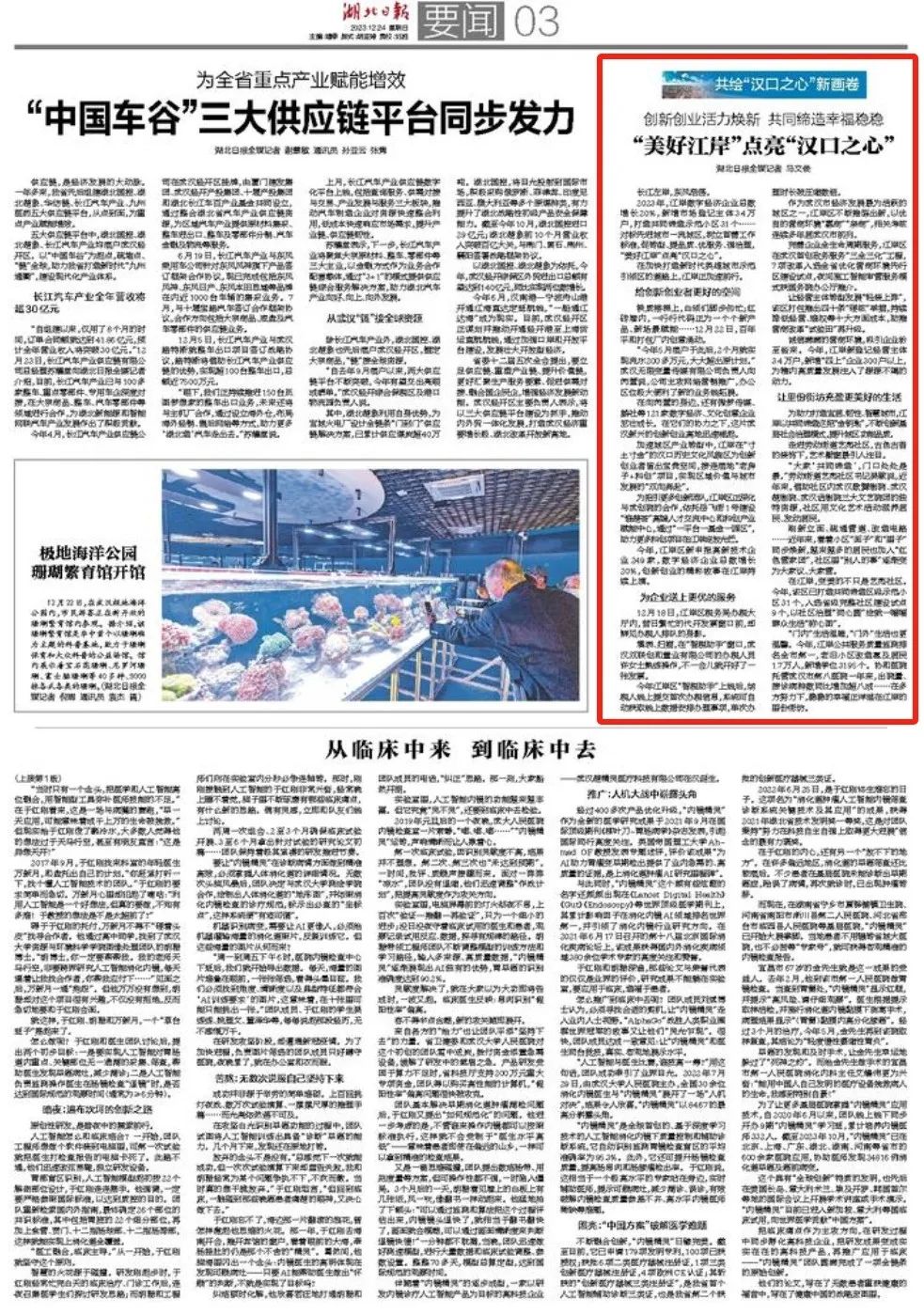 12月24日,《湖北日报》要闻版报道“美好江岸”点亮“汉口之心”。全文如下: