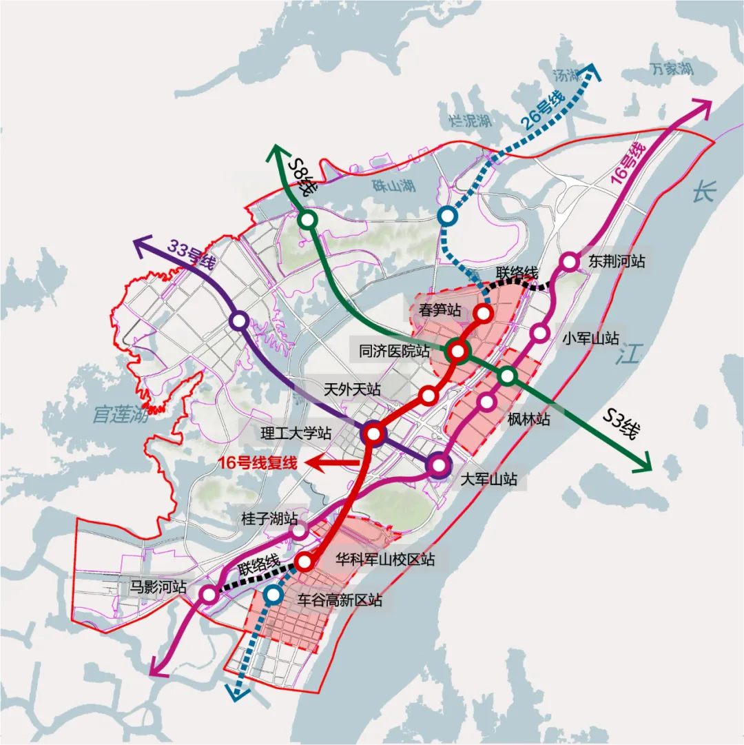 根据初步规划,轨道交通16号线复线将新建东荆河-春笋段-华科大军山校区-马影河段,线路总长15.19公里,暂定设春笋站、同济医院站、天外天站、理工大学站和华科大军山校区站等5座站点(不含接轨点)。未来,16号线复线(春笋站-华科大军山校区站)将成为轨道交通26号线的一部分,东荆河-春笋段、华科大军山校区-马影河段将作为16号线与26号线联络线。