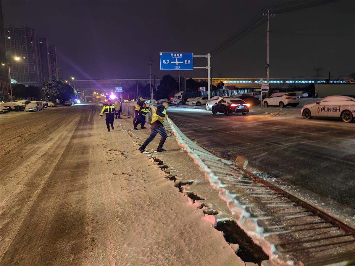 为从源头消除交通安全隐患,武汉交警重点排查桥梁、涵洞、坡道、弯道、上下桥匝道、新城区道路等易结冰路段,不间断开展道路结冰情况巡查检测,采取“定点值守+动态巡逻+视频巡查”方式,发现隐患第一时间协调处置,同时联动城管、环卫等相关部门,开展除冰融雪;针对部分道路暂时无法通行的,采取临时管制措施、增加警力部署,及时应对突发交通情况,保障市民的出行安全。