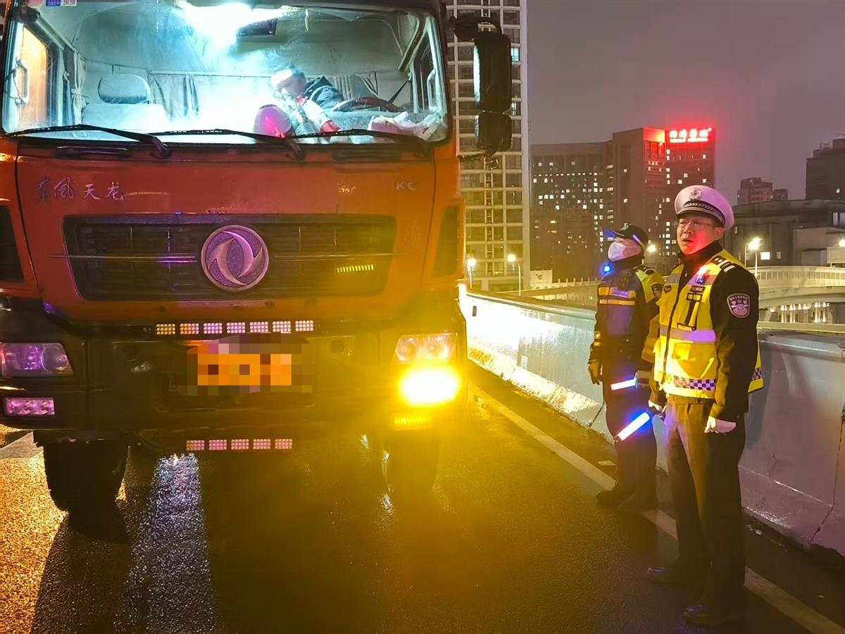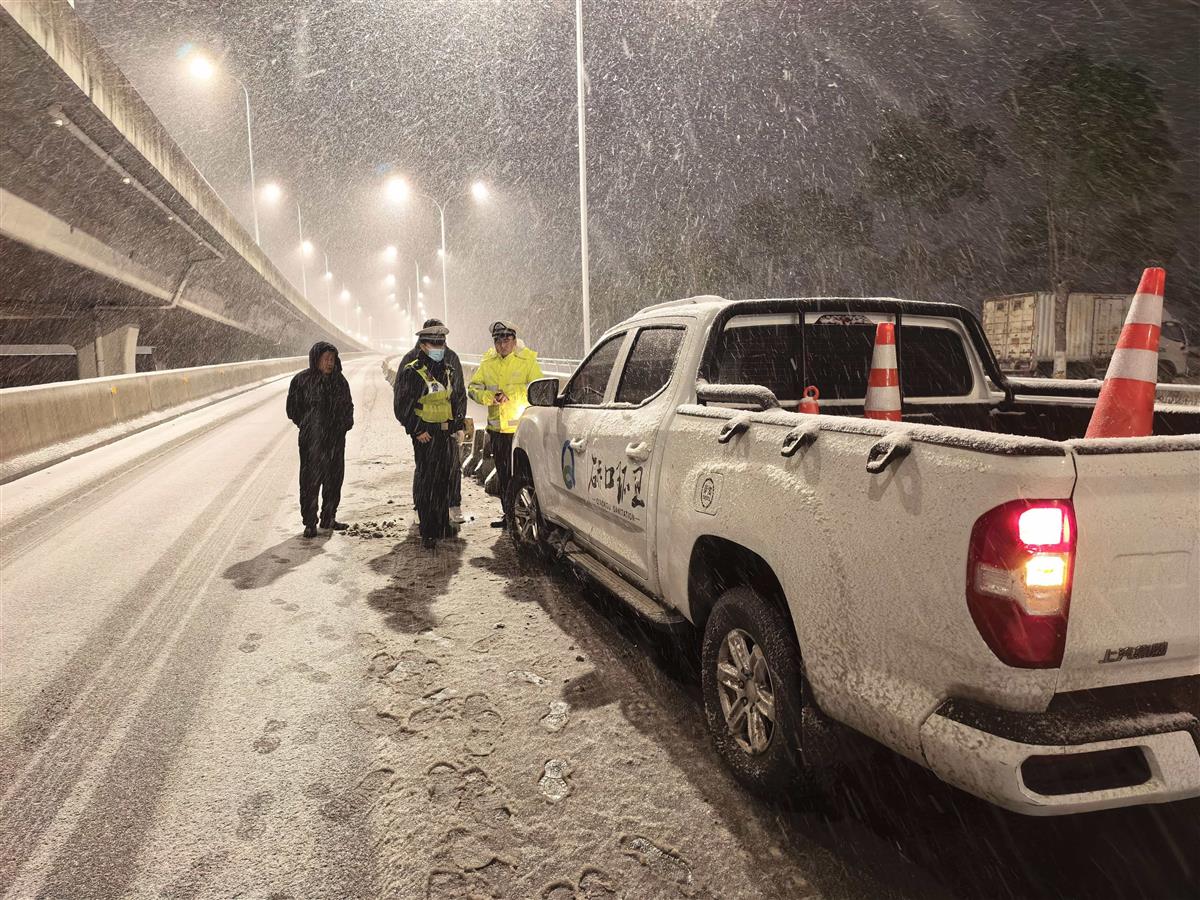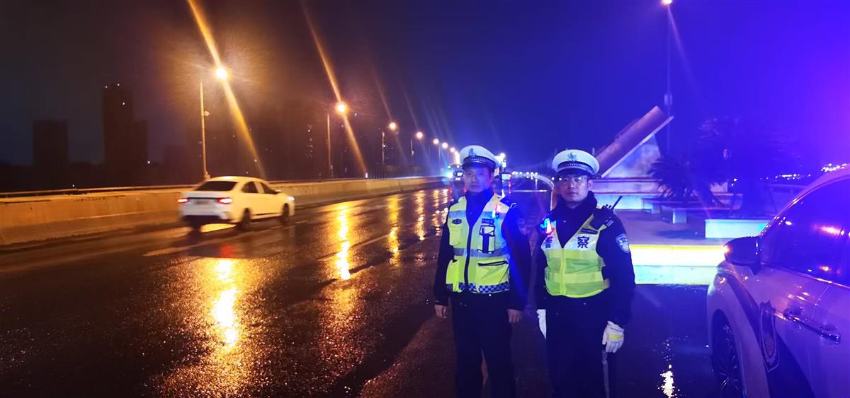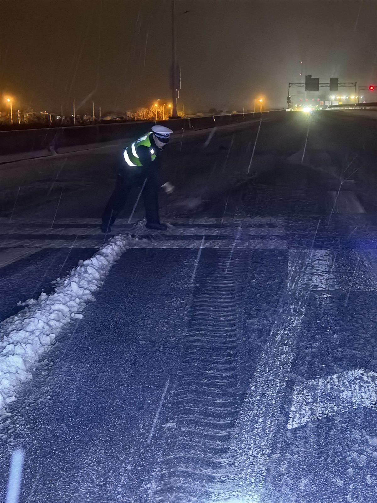 民警吴创在夜间巡逻至沌口大桥徐长向下桥武深高速匝道口时,发现积雪逐渐覆盖交通标线,立即设置警示标志,提醒过往车辆减速通行,并联系养护部门到场开展机械除冰、补充撒布融雪剂等处置,消除了该路段的安全隐患,保障匝道通行秩序。
